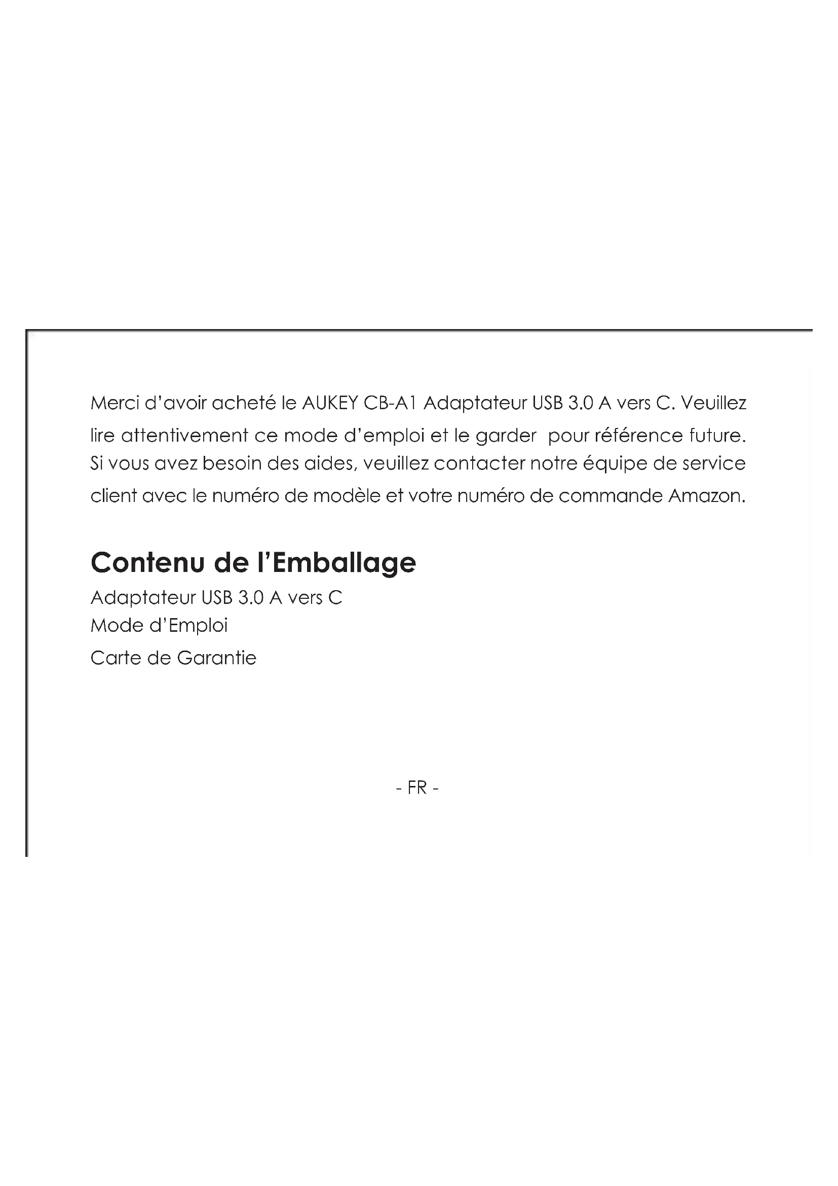 - Wichtiger Hinweis: AUKEY bietet nur für die Produkte einen Kundenservice an, die direkt bei AUKEY erworben wurden. Sollten Sie Ihr Produkt bei einem anderen Händler gekauft haben, kontaktieren Sie bitte dessen Kundendienst bezüglich Fragen oder Garantieansprüchen.- FR - Merci d’avoir acheté le AUKEY CB-A1 Adaptateur USB 3.0 A vers C. Veuillez lire attentivement ce mode d’emploi et le garder pour référence future. Si vous avez besoin des aides, veuillez contacter notre équipe de service client avec le numéro de modèle et votre numéro de commande Amazon. Contenu de l’Emballage Adaptateur USB 3.0 A vers C Mode d’Emploi Carte de Garantie- FR - Modèle Connecteur Dimensions Poids CB-A1 USB-C, USB-A 35 × 15,8 × 8,27mm / 1,2” × 0,62” × 0,32” 9g / 0,32oz Spécifications- FR - Garantie & Service Client Pour des questions, soutiens ou demandes de garanties, veuillez nous contacter à l'adresse appropriée ci-dessous. Veuillez inclure votre numéro de commande Amazon et le numéro de modèle du produit. Amazon EU commandes: support.eu@aukey.com