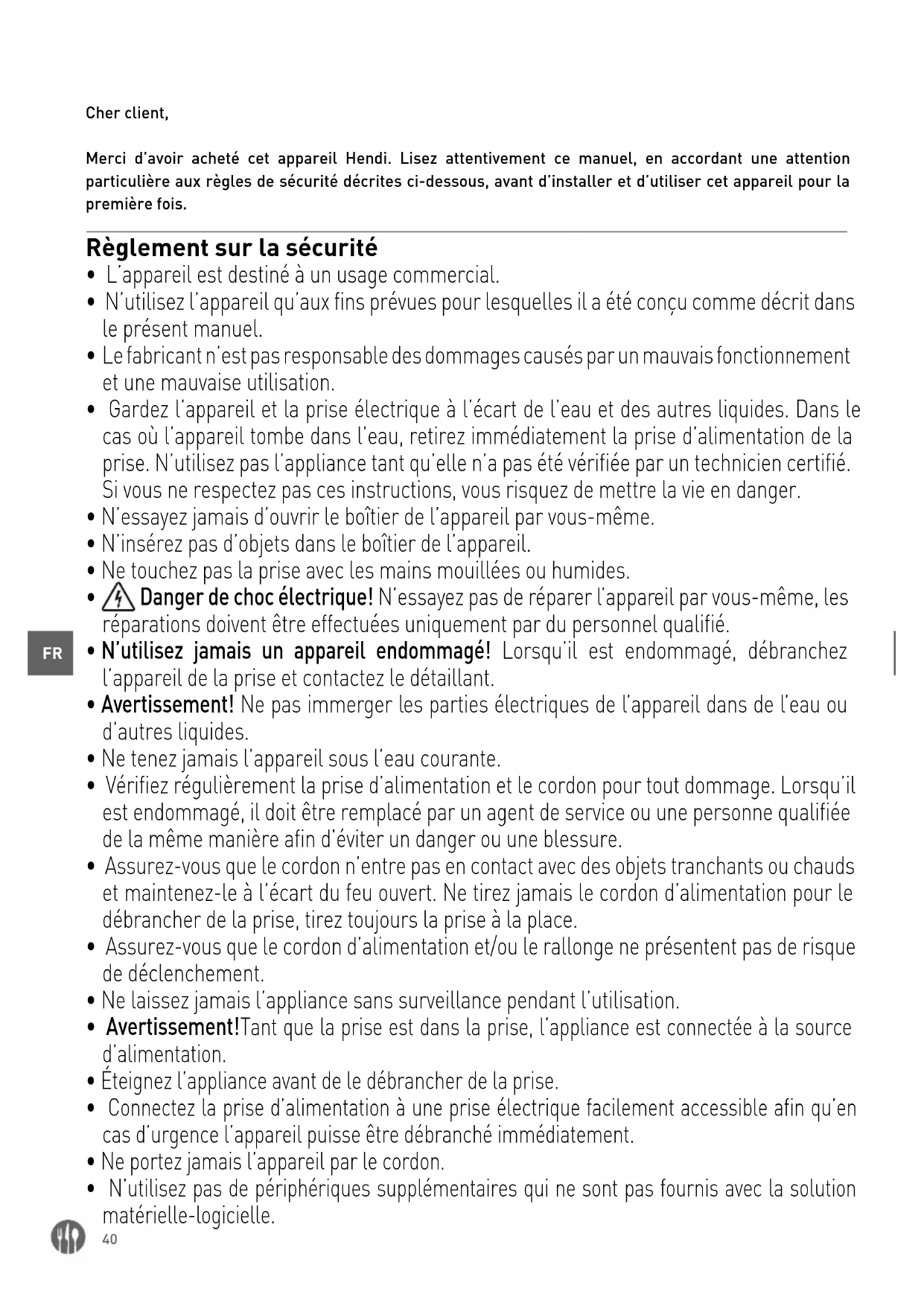 Cher client, Merci d’avoir acheté cet appareil Hendi. Lisez attentivement ce manuel, en accordant une attention particulière aux règles de sécurité décrites ci-dessous, avant d’installer et d’utiliser cet appareil pour la première fois. Règlement sur la sécurité