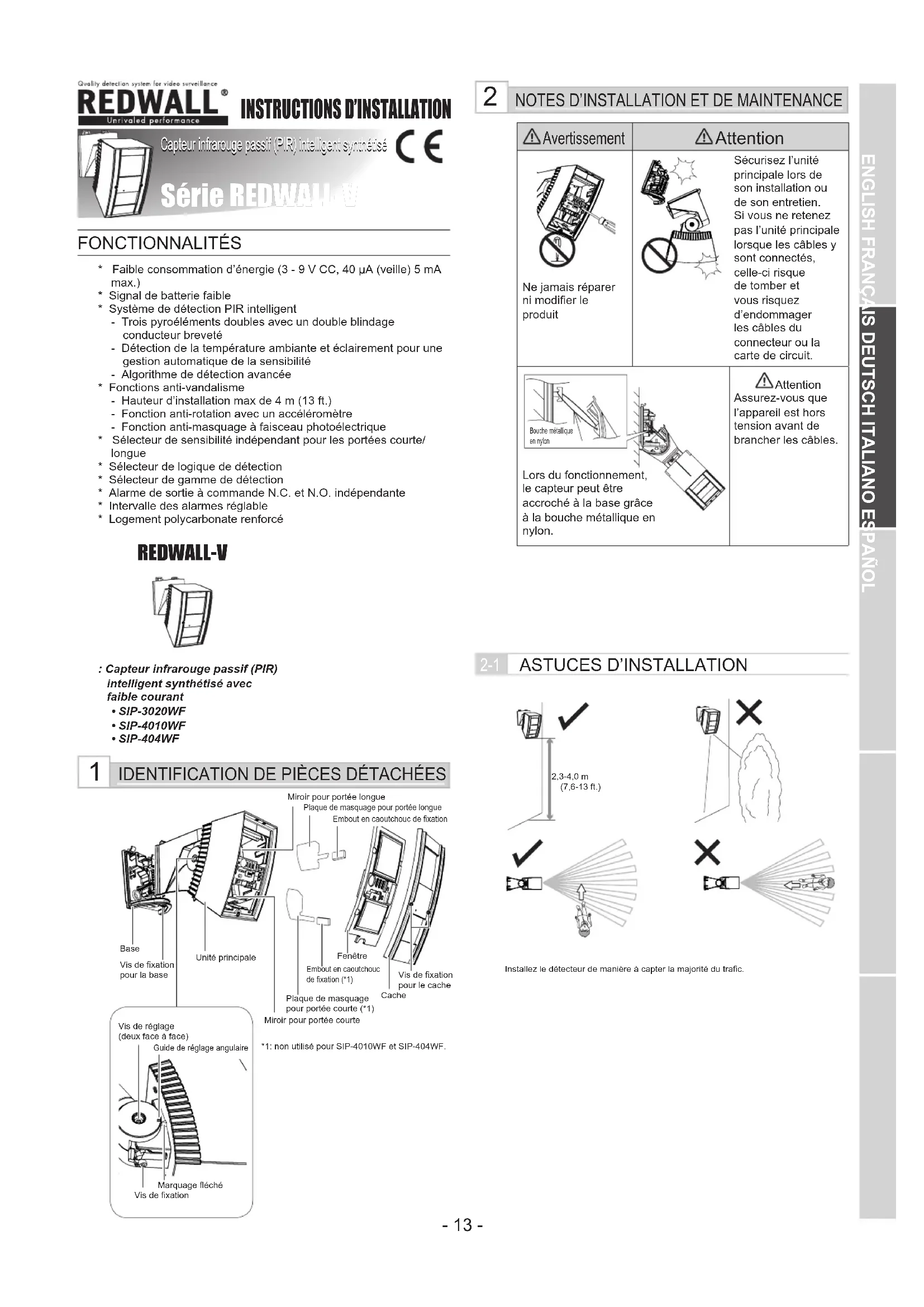 Redwall SIP404WF - Détecteur de mouvement OPTEX - Notice d'utilisation et mode d'emploi gratuit