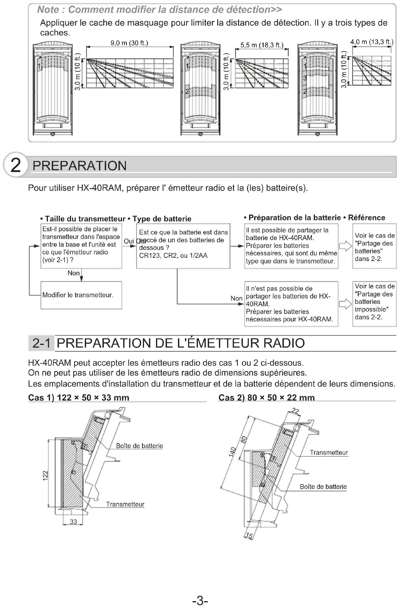 - Préparation de la batterie • Référence Est-il possible de placer le transmetteur dans l'espace entre la base et l'unité est ce que l'émetteur radio (voir 2-1) ?Modifier le transmetteur.Est ce que la batterie est dans poccè de un des batteries de dessous ?CR123, CR2, ou 1/2AAIl est possible de partager la batterie de HX-40RAM.Préparer les batteries nécessaires, qui sont du même type que dans le transmetteur.Il n'est pas possible de partager les batteries de HX-40RAM.Préparer les batteries nécessaires pour HX-40RAM.Voir le cas de "Partage des batteries" dans 2-2.Voir le cas de "Partage des batteries impossible" dans 2-2. Appliquer le cache de masquage pour limiter la distance de détection. Il y a trois types de caches. Note : Comment modifier la distance de détection>>