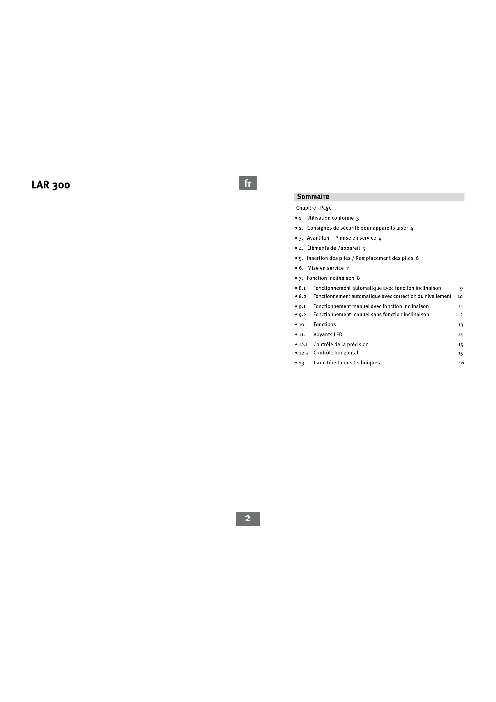 - Voyants LED 14 12.1 Contrôle de la précision 15 12.2 Contrôle horizontal 15