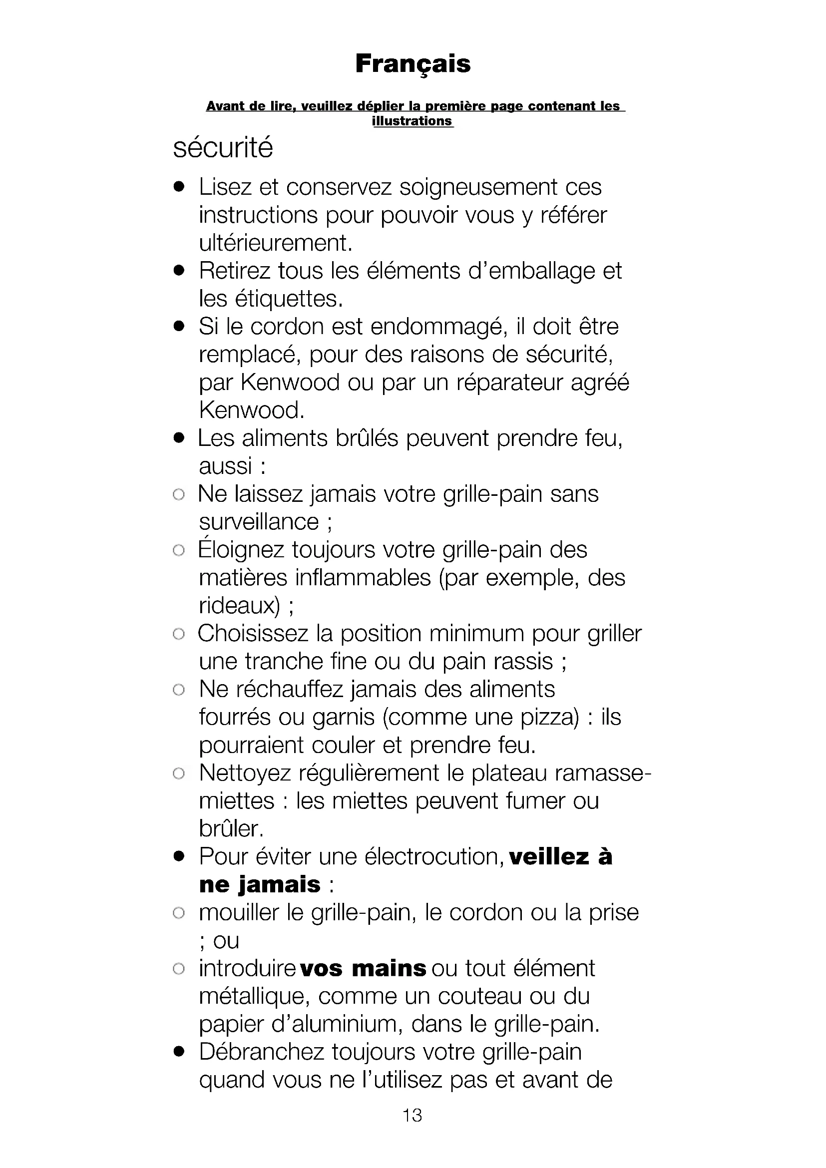 Débranchez toujours votre grille-pain quand vous ne l’utilisez pas et avant de Avant de lire, veuillez déplier la première page contenant les illustrationsEnglish