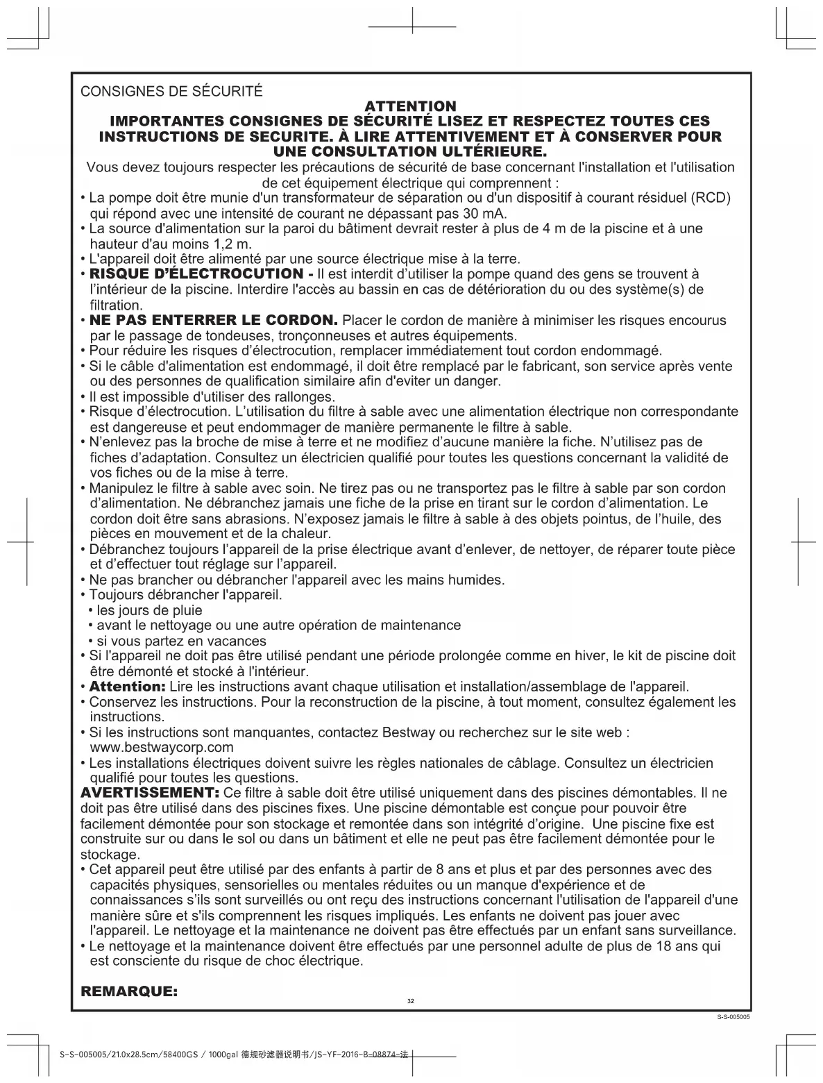 IMPORTANT: cette procédure enlève l’eau de la piscine, il faut donc que vous la remplaciez. Éteignez le filtre à sable immédiatement si le niveau de l’eau descend près des vannes d’entrée et de sortie de la piscine. Lavage à contre-courant RinçageS-S-005005 S-S-005005/21.0x28.5cm/58400GS / 1000gal 德规砂滤器说明书/JS-YF-2016-B-08874-法