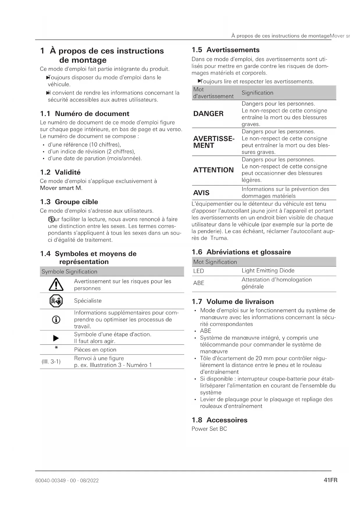 79 Période d'arrêt prolongé 56 8 Réparation 56 9 Mise au rebut et recyclage 57 91 Mise au rebut du système de manœuvre 57 92 Mise au rebut de la télécommande et des piles 57 10 Caractéristiques techniques 57 11 Garantie 58 111 Étendue de la garantie du fabricant 58 112 Exclusion de la garantie 58 113 Recours en garantie 5960040-00349 ∙ 00 ∙ 08/2022 À propos de ces instructions de montageMover smart M 41FR 1 À propos de ces instructions de montage Ce mode d'emploi fait partie intégrante du produit Toujours disposer du mode d'emploi dans le véhicule Il convient de rendre les informations concernant la sécurité accessibles aux autres utilisateurs