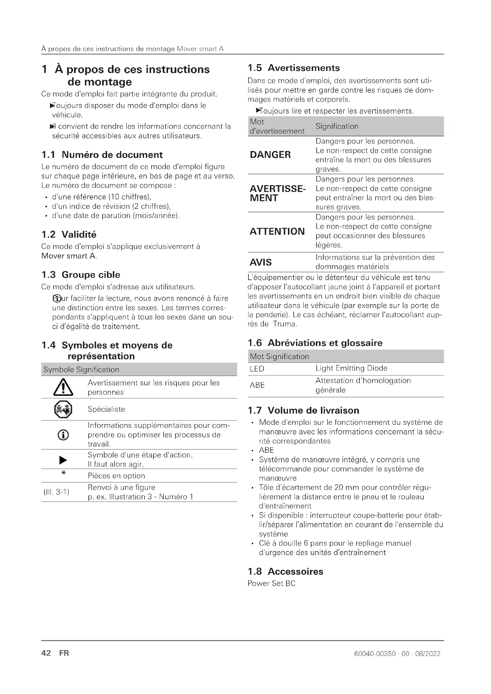 Date of purchase The authorised service partner or the Truma Service Centre will then specify the further procedure To avoid transport damage, the affected appliance must only be shipped by prior arrangement with the authorised ser- vice partner or the Truma Service Centre We ask you not to send in an appliance without prior arrangement If the warranty claim is recognised by the Manufactu- rer, then the transport expenses shall be borne by the same If no warranty claim is applicable, the Consumer will be notified accordingly and any repair and transport expenses shall then be the Consumer’s liability60040-00350 ∙ 00 ∙ 08/2022 Mover smart A 41FR Table des matières 1 À propos de ces instructions de montage 42 11 Numéro de document 42 12 Validité 42 13 Groupe cible 42 14 Symboles et moyens de représentation 42 15 Avertissements 42 16 Abréviations et glossaire 42 17 Volume de livraison 42 18 Accessoires 42 2 Informations concernant la sécurité 43 21 Sécurité générale 43 22 Obligations de l'exploitant/du détenteur du véhi- cule 43 23 Fonctionnement sûr 43 24 Comportement en cas de pannes 44 3 Utilisation 44 31 Utilisation conforme 44 32 Utilisation non conforme 44 33 Montage, démontage, transformation 44 4 Description du produit 45 41 Structure 45 42 Identification du produit 46 43 Fonction 46 44 Alimentation en courant 46 45 Télécommande 46 5 Utilisation 48 51 Dételage du véhicule tracteur 48 52 Mise en marche du système de manœuvre 48 53 Placage du système de manœuvre 49 54 Manœuvrer la caravane 50 55 Attelage au véhicule tracteur 52 56 Repliage du système de manœuvre 52 57 Repliage manuel du système de manœuvre (re- pliage d'urgence) 53 58 Arrêt du système de manœuvre 54 6 Pannes 54 61 Recherche de pannes 54 62 Accord de la commande électronique avec la té- lécommanderadio 55 7 Entretien et maintenance 56 71 Entretien de la batterie 12V 56 72 Entretien de la télécommande 56 73 Entretien des pneus 56 74 Entretien de l'unité d'entraînement 56 75 Maintenance du système de manœuvre 56 76 Maintenance des pneus 57 77 Maintenance de la commande 57 78 Contrôle de la distance entre le rouleau et le pneu 57 79 Période d'arrêt prolongé 57 8 Réparation 57 9 Mise au rebut et recyclage 58 91 Mise au rebut du système de manœuvre 58 92 Mise au rebut de la télécommande et des piles 58 10 Caractéristiques techniques 58 11 Garantie 59 111 Étendue de la garantie du fabricant 59 112 Exclusion de la garantie 59 113 Recours en garantie 6042 60040-00350 ∙ 00 ∙ 08/2022 À propos de ces instructions de montage Mover smart A
