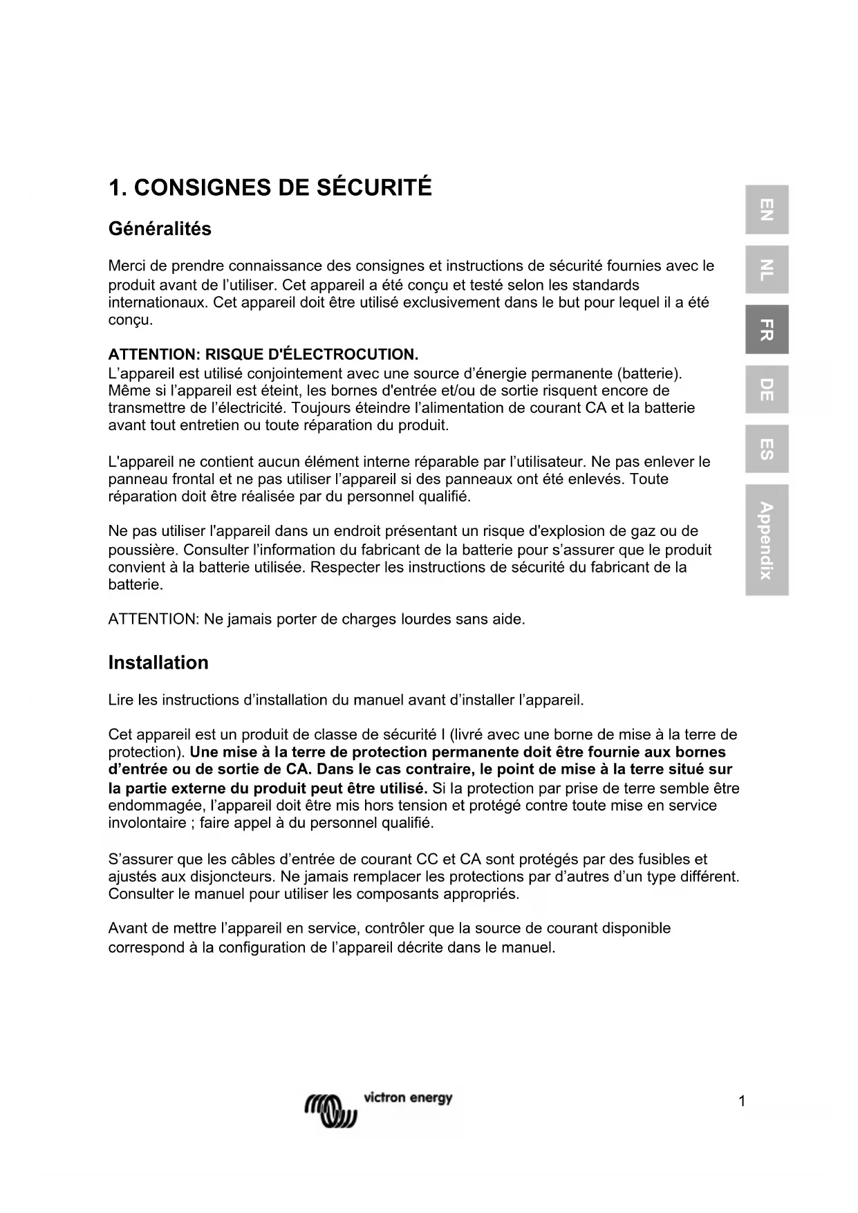 Caractéristiques de charge adaptative en 4 étapes : bulk – absorption – float – veille Le système de gestion de batterie adaptative contrôlé par microprocesseur peut être réglé pour divers types de batteries. La fonction « adaptative » adapte automatiquement le processus de charge à l'utilisation de la batterie. La bonne dose de charge : durée d'absorption variable Dans le cas d'un léger déchargement de batterie, l'absorption est maintenue réduite afin d'empêcher une surcharge et une formation de gaz excessive. Après un déchargement important, le temps d'absorption est automatiquement élevé afin de charger complètement la batterie. Prévention des détériorations dues au gazage : Le mode BatterySafe Si, pour recharger rapidement une batterie, une puissance de charge élevée est associée à une tension d'absorption élevée, la détérioration due à un gazage excessif sera évité en limitant automatiquement la progression de la tension, dès que la tension de gazage a été atteinte. Moins d'entretien et de vieillissement si la batterie n'est pas utilisée : mode veille Le mode veille se déclenche lorsque la batterie n'a pas été sollicitée pendant 24 heures. En mode veille, la tension float est réduite à 2,2 V / cellule (13,2 V pour une batterie de 12 V) pour minimiser le gazage et la corrosion des plaques positives. Une fois par semaine, la tension est relevée au niveau d'absorption pour « égaliser » la batterie. Ce procédé empêche la stratification de l'électrolyte et la sulfatation, causes majeures du vieillissement prématuré des batteries. Deux sorties CC pour le chargement de deux batteries La borne principale CC peut fournir la totalité du courant de sortie. La seconde sortie, prévue pour la charge d'une batterie de démarrage, est limitée à 4 A et sa tension de sortie est légèrement inférieure. Augmentation de la durée de vie de la batterie : compensation de température La sonde de température, qui est fournie avec le produit, sert à réduire la tension de charge quand la température de la batterie augmente. Ceci est particulièrement important pour les batteries sans entretien qui pourraient se dessécher suite à une surcharge. Plus d'infos sur les batteries et leur charge Notre livre « Énergie sans limites » donne de plus amples informations sur les batteries et leur charge. Il est disponible gratuitement sur notre site Web (voir www.victronenergy.com -> Support et Téléchargements -> Infos techniques générales). Pour plus d'informations sur les caractéristiques de charge adaptive, veuillez vous référer à la section "Infos techniques générales" sur notre site Web.5 EN NL FR DE ES Appendix
