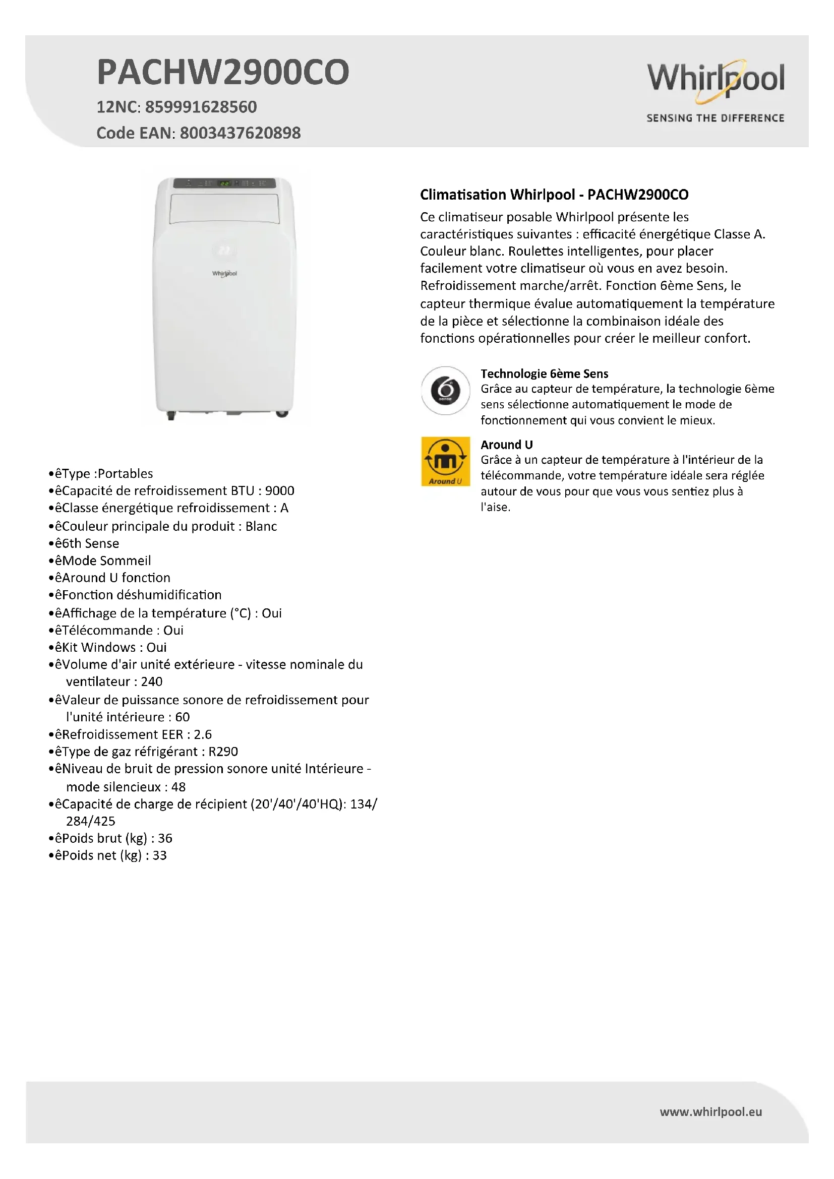 PACHW2900CO - Climatisation WHIRLPOOL - Notice d'utilisation et mode d'emploi gratuit