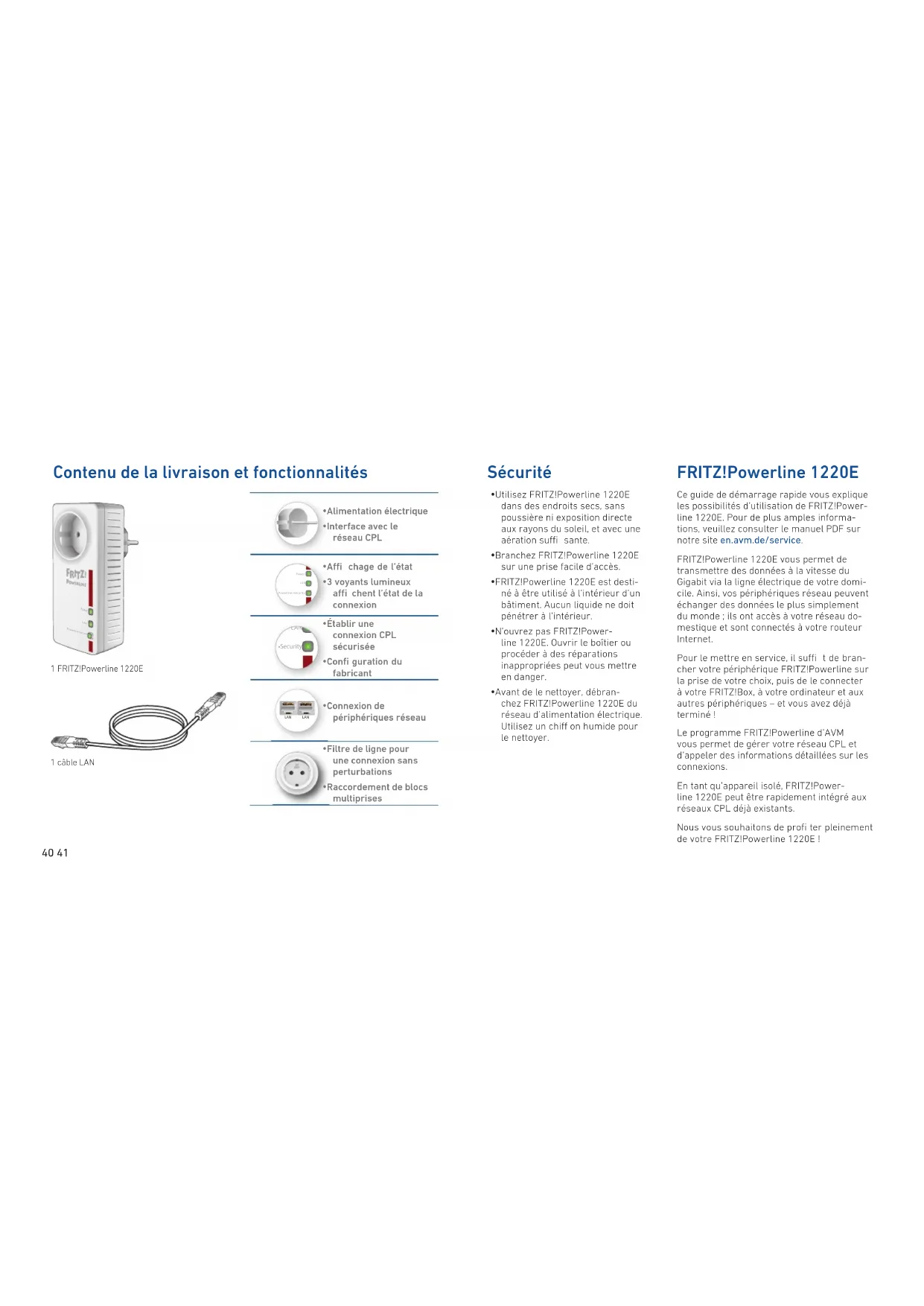 - Raccordement de blocs multiprises 1FRITZ!Powerline1220E 1câble LAN FRITZ!Powerline1220E Ce guide de démarrage rapide vous explique les possibilités d’utilisation de FRITZ!Power- line1220E. Pour de plus amples informa- tions, veuillez consulter le manuel PDF sur notre site en.avm.de/service. FRITZ!Powerline1220E vous permet de transmettre des données à la vitesse du Gigabit via la ligne électrique de votre domi- cile. Ainsi, vos périphériques réseau peuvent échanger des données le plus simplement du monde; ils ont accès à votre réseau do- mestique et sont connectés à votre routeur Internet. Pour le mettre en service, il suffi t de bran- cher votre périphériqueFRITZ!Powerline sur la prise de votre choix, puis de le connecter à votre FRITZ!Box, à votre ordinateur et aux autres périphériques – et vous avez déjà terminé! Le programme FRITZ!Powerline d’AVM vous permet de gérer votre réseauCPL et d’appeler des informations détaillées sur les connexions. En tant qu’appareil isolé, FRITZ!Power- line1220E peut être rapidement intégré aux réseaux CPL déjà existants. Nous vous souhaitons de profi ter pleinement de votre FRITZ!Powerline1220E! 40 41Phase (L) Neutre (N) Conducteur de protection (PE) Paire supplémentaire Paire standard