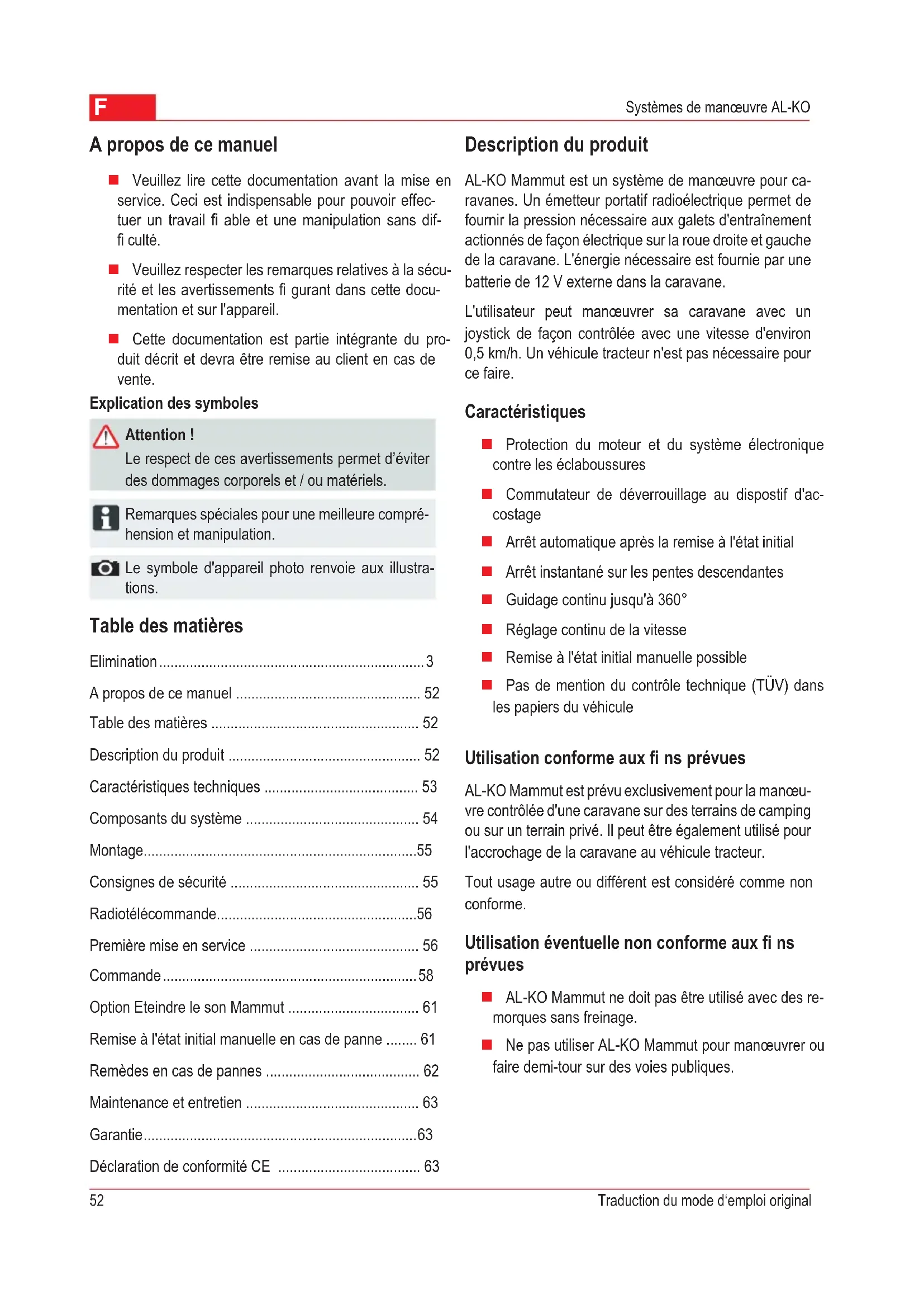 rectement en position initiale. Manœuvrer la remorque Le système de manœuvre AL-KO Mammut est comman- dé avec la radiotélécommande. La vitesse et le guidage sont réglés de façon continue avec le joystick. Consignes de sécurité Attention - Risque de blessures ! Avant de manœuvrer votre remorque avec l'en- traînement Mammut, il faudra toujours respecter les consignes de sécurité suivantes. Pendant le service, veiller à maintenir une distance de sécurité suffi sante entre la remorque et des per- sonnes et des objets. L'utilisateur doit maintenir une distance minimum de 0,5 m avec la remorque pendant la manœuvre. Contrôlez également les côtés de la caravane qui ne vous font pas face. Si nécessaire, demander de l'aide à d'autres person- nes pour les mesures de protection. Ne pas toucher les galets d'entraînement pendant le service – Risques de blessures (écrasement) ! AL-KO Mammut ne doit être manœuvré que par des personnes ayant atteint la majorité. Lors de la manœuvre, aucune personne ne doit se trouver dans la remorque. Le système de manœuvre ne doit pas être utilisé pour manœuvrer ou faire demi-tour sur des voies publiques. ne pas être utilisé sous l'emprise de l'alcool, de drogues ou de médicaments. Dans les pentes ascendantes / descendantes, il y a un risque particulier : Respecter les pentes ascendantes / descen- dantes maximum autorisées. Respecter la distance avec la remorque. Toujours orienter la barre d'attelage vers la pente descendante. Eviter d'accrocher et de décrocher la remorque en pente.F Traduction du mode d‘emploi original