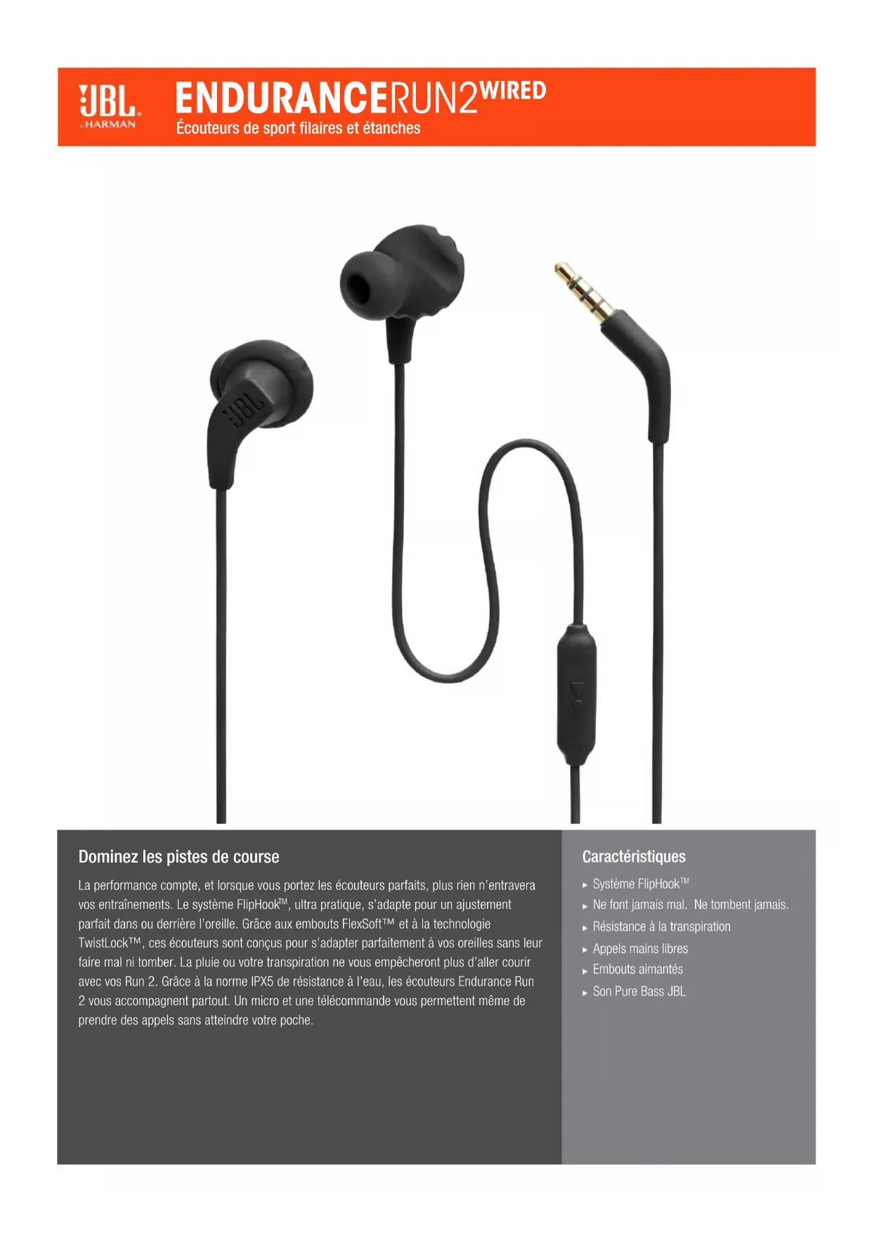 , ultra pratique, s’adapte pour un ajustement parfait dans ou derrière l’oreille. Grâce aux embouts FlexSoft™ et à la technologie TwistLock™, ces écouteurs sont conçus pour s’adapter parfaitement à vos oreilles sans leur faire mal ni tomber. La pluie ou votre transpiration ne vous empêcheront plus d’aller courir avec vos Run 2. Grâce à la norme IPX5 de résistance à l’eau, les écouteurs Endurance Run 2 vous accompagnent partout. Un micro et une télécommande vous permettent même de prendre des appels sans atteindre votre poche. Écouteurs de sport filaires et étanches ENDURANCERUN2 WIREDHARMAN International Industries, Incorporated8500 Balboa Boulevard, Northridge, CA 91329 USAwww.jbl.com© 2022 HARMAN International Industries, Incorporated. All rights reserved. JBL is a trademark of HARMAN International Industries, Incorporated, registered in the United States and/or other countries. The Bluetooth word mark and logos are registered trademarks owned by Bluetooth SIG, Inc. and any use of such marks by HARMAN International Industries, Incorporated is under license. Other trademarks and trade names are those of their respective owners. Features, specifications and appearance are subject to change without notice. Caractéristiques techniques: Taille du haut-parleur: haut-parleur dynamique de 8,2mmClassement IPX: IPX5 Réponse en fréquence: 20Hz - 20kHz Contenu de la boîte: 1Endurance Run 2 Wired3tailles d’embouts1stabilisateur1garantie/avertissement 1fiche de sécurité/guide de démarrage rapide Caractéristiques & Points Forts Système FlipHook