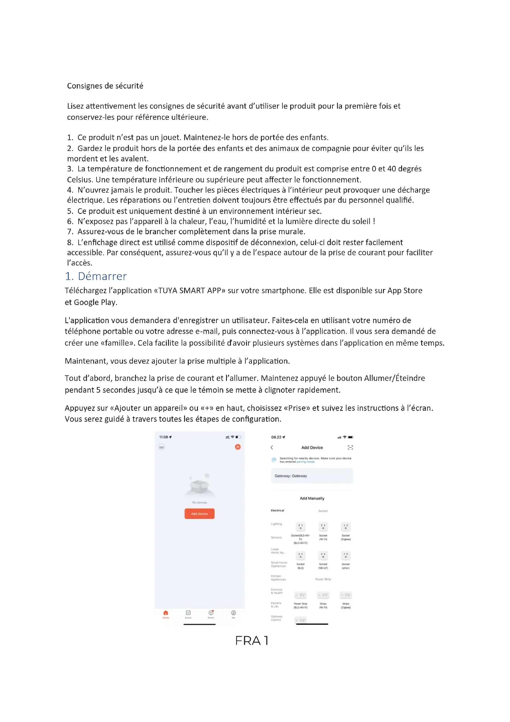 Téléchargez l’applicaon «TUYASMARTAPP» sur votre smartphone. Elle est disponible sur App Store et Google Play. L'applicaon vous demandera d'enregistrer un ulisateur. Faites-cela en ulisant votre numéro de téléphone portable ou votre adresse e-mail, puis connectez-vous à l’applicaon. Il vous sera demandé de créer une «famille». Cela facilite la possibilité d’avoir plusieurs systèmes dans l’applicaon en même temps. Maintenant, vous devez ajouter la prise mulple à l’applicaon. Tout d’abord, branchez la prise de courant et l’allumer. Maintenez appuyé le bouton Allumer/Éteindre pendant 5 secondes jusqu’à ce que le témoin se mee à clignoter rapidement. Appuyez sur «Ajouter un appareil» ou «+» en haut, choisissez «Prise» et suivez les instrucons à l’écran. Vous serez guidé à travers toutes les étapes de configuraon. FRA 12. Ulisaon quodienne Dans votre écran d’accueil de l’applicaon, vous pouvez maintenant trouver votre prise mulple. Appuyez dessus et vous obendrez la page de la prise de courant. Là, vous pouvez allumer, éteindre, créer des minuteurs, etc.