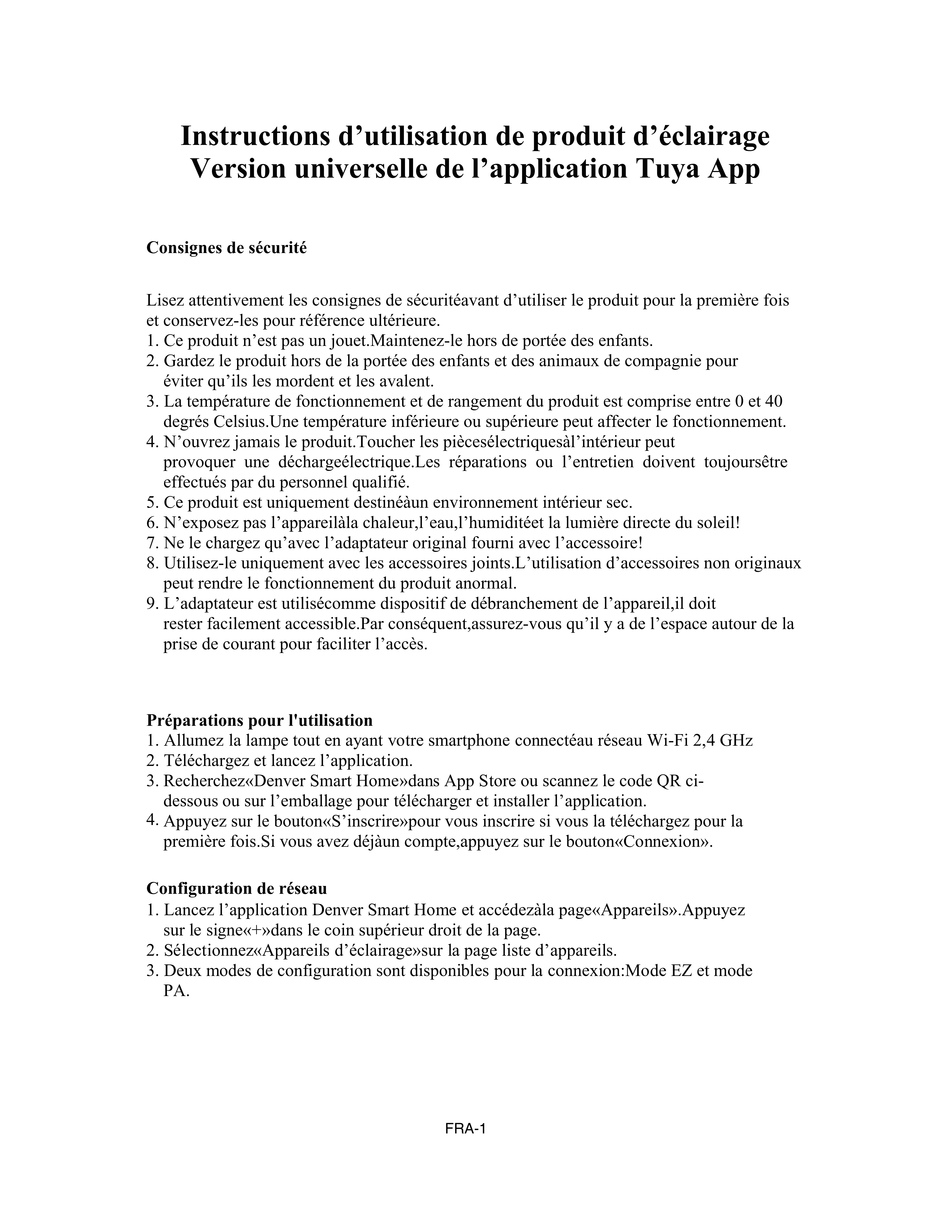 Instructions d’utilisation de produit d’éclairage Version universelle de l’application Tuya App Consignes de sécurité Lisez attentivement les consignes de sécuritéavant d’utiliser le produit pour la première fois et conservez-les pour référence ultérieure.