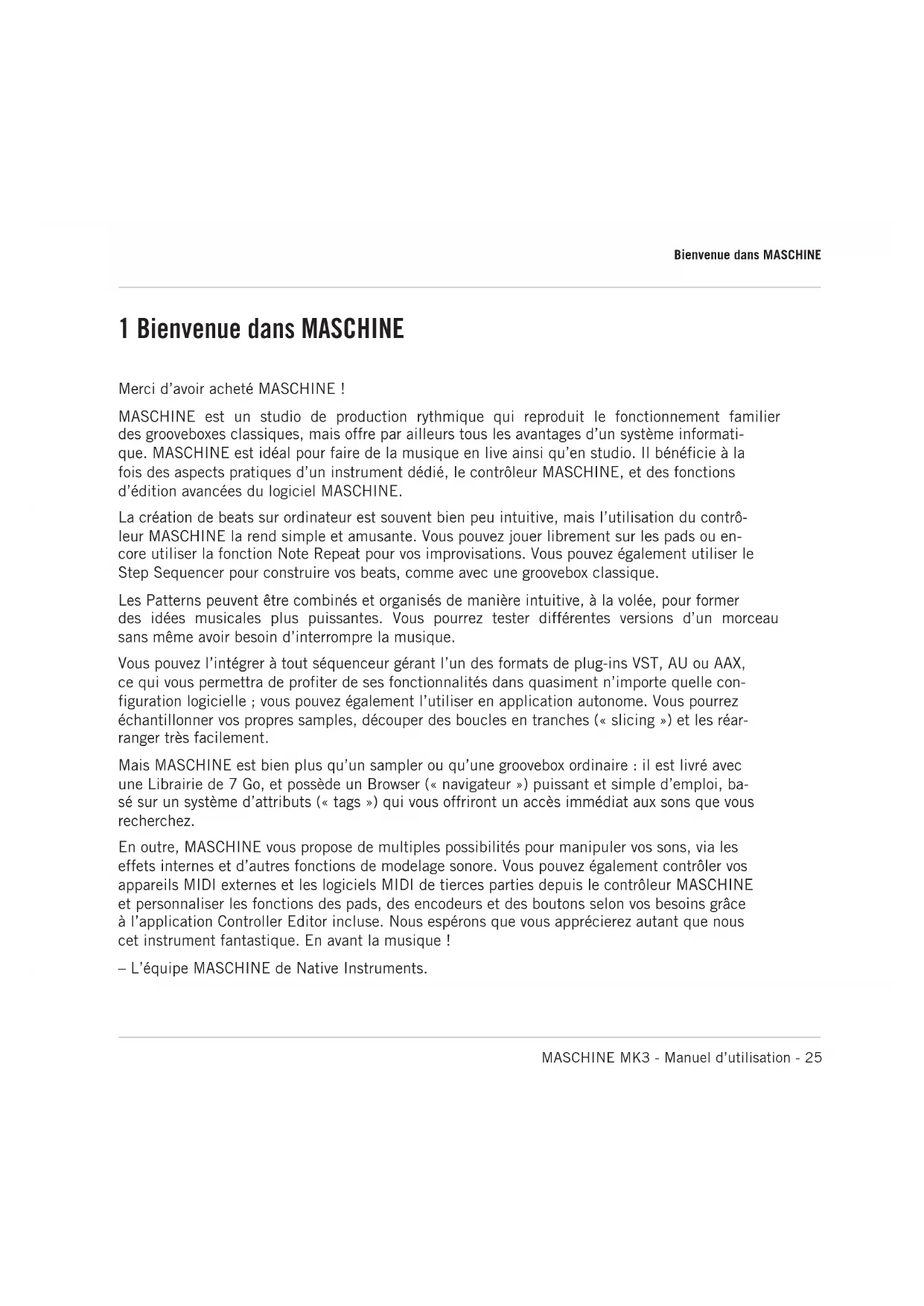 MASCHINE MK3 MANUEL D'UTILISATIONLes informations contenues dans ce document peuvent être modifiées à tout moment sans pré- avis et n’engagent pas la responsabilité de Native Instruments GmbH. Le logiciel décrit dans ce document est soumis à l’acceptation d’un Accord de Licence et sa copie sur tout autre sup- port est interdite. Aucune partie de ce manuel ne peut être copiée, reproduite, transférée ni enregistrée, sous quelque forme que ce soit et pour quelque usage que ce soit, sans l’accord écrit préalable de Native Instruments GmbH, dénommée ci-après Native Instruments. « Native Instruments », « NI » et les logos associés sont des marques (déposées) de Native Instruments GmbH. ASIO, VST, HALion and Cubase are registered trademarks of Steinberg Media Technologies GmbH. Tous les autres produits et noms de sociétés sont des marques™ ou des marques déposées© de leurs propriétaires respectifs. Leur utilisation n'implique aucune afilliation ou approbation de leurs parts. Écrit par : David Gover, Nicolas Sidi Traduit par : Nicolas Durand Version du logiciel : 2.8 (02/2019) version du contrôleur : MASCHINE MK3 Nous remercions tout particulièrement l’équipe des bêta-testeurs dont l’aide nous est précieu- se, non seulement pour trouver et corriger les bogues, mais aussi pour continuellement amélio- rer ce produit ! AvertissementNATIVE INSTRUMENTS GmbH Schlesische Str. 29-30 D-10997 Berlin Germany www.native-instruments.de NATIVE INSTRUMENTS North America, Inc. 6725 Sunset Boulevard 5th Floor Los Angeles, CA 90028 USA www.native-instruments.com NATIVE INSTRUMENTS K.K. YO Building 3F Jingumae 6-7-15, Shibuya-ku, Tokyo 150-0001 Japan www.native-instruments.co.jp NATIVE INSTRUMENTS UK Limited 18 Phipp Street London EC2A 4NU
