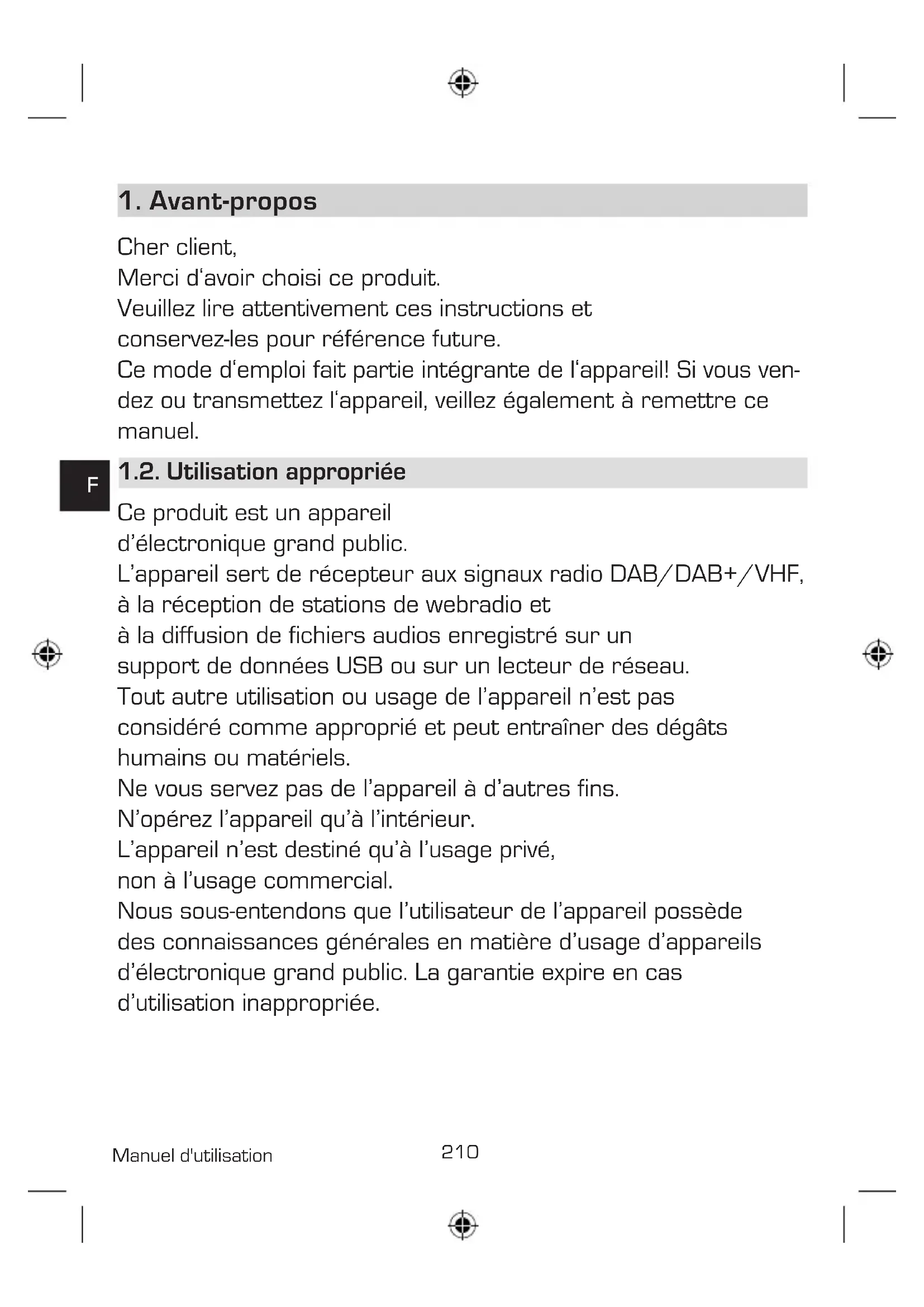 Manuel d'utilisation Cher client, Merci d‘avoir choisi ce produit. Veuillez lire attentivement ces instructions et conservez-les pour référence future. Ce mode d‘emploi fait partie intégrante de l‘appareil! Si vous ven- dez ou transmettez l‘appareil, veillez également à remettre ce manuel. 1.2. Utilisation appropriée Ce produit est un appareil d’électronique grand public. L’appareil sert de récepteur aux signaux radio DAB/DAB+/VHF, à la réception de stations de webradio et à la diffusion de fichiers audios enregistré sur un support de données USB ou sur un lecteur de réseau. Tout autre utilisation ou usage de l’appareil n’est pas considéré comme approprié et peut entraîner des dégâts humains ou matériels. Ne vous servez pas de l’appareil à d’autres fins. N’opérez l’appareil qu’à l’intérieur. L’appareil n’est destiné qu’à l’usage privé, non à l’usage commercial. Nous sous-entendons que l’utilisateur de l’appareil possède des connaissances générales en matière d’usage d’appareils d’électronique grand public. La garantie expire en cas d’utilisation inappropriée.