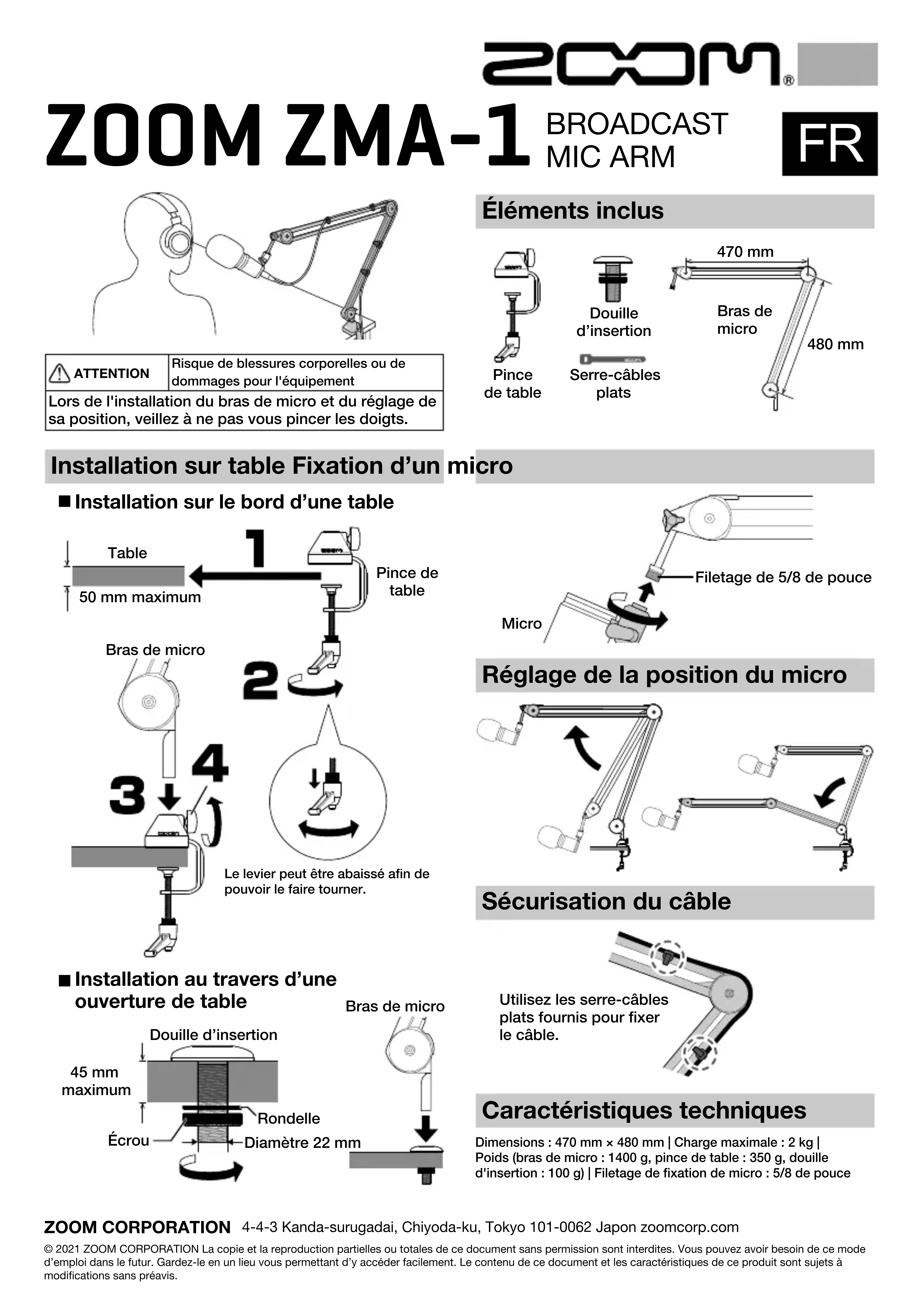 ZOOM ZMA-1 BROADCAST MIC ARM ZOOM CORPORATION4-4-3 Kanda-surugadai, Chiyoda-ku, Tokyo 101-0062 Japon zoomcorp.com © 2021 ZOOM CORPORATION La copie et la reproduction partielles ou totales de ce document sans permission sont interdites. Vous pouvez avoir besoin de ce mode d’emploi dans le futur. Gardez-le en un lieu vous permettant d’y accéder facilement. Le contenu de ce document et les caractéristiques de ce produit sont sujets à modications sans préavis.