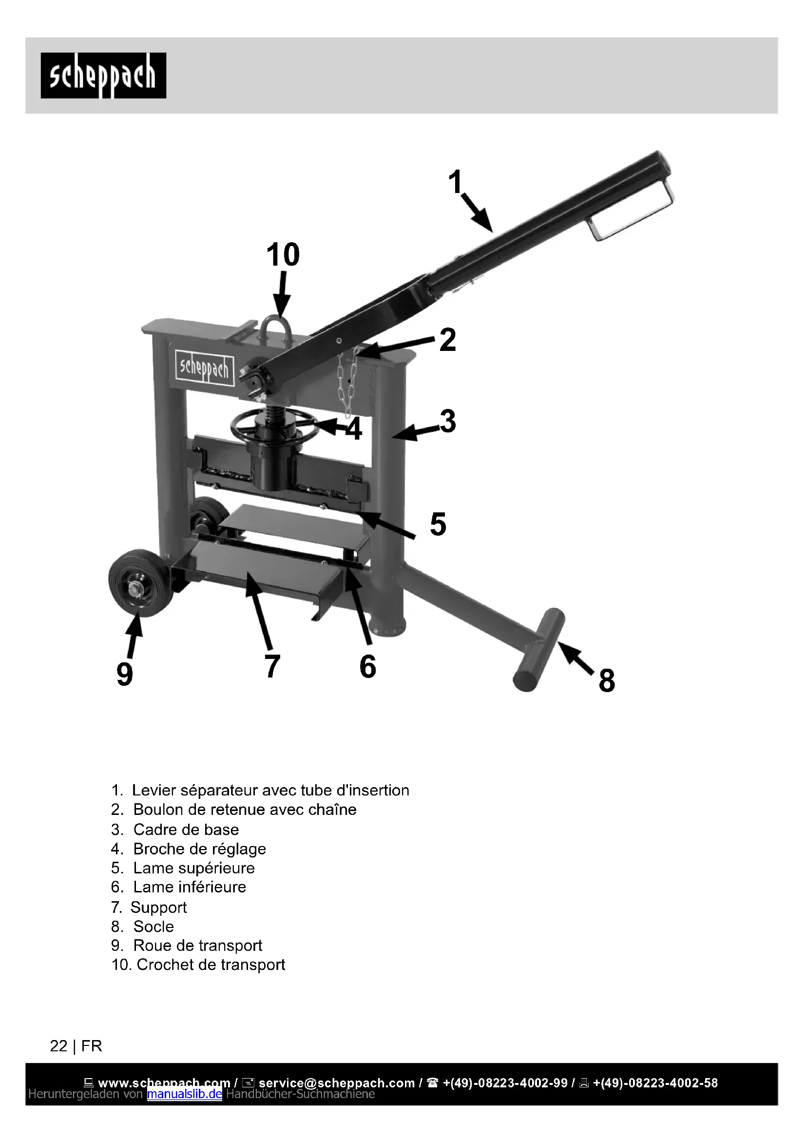 - Les réparations ne doivent être effectuées que par des ateliers agréés. Heruntergeladen von manualslib.de Handbücher-Suchmachiene www.scheppach.com / service@scheppach.com / +(49)-08223-4002-99 / +(49)-08223-4002-58 FR | 25