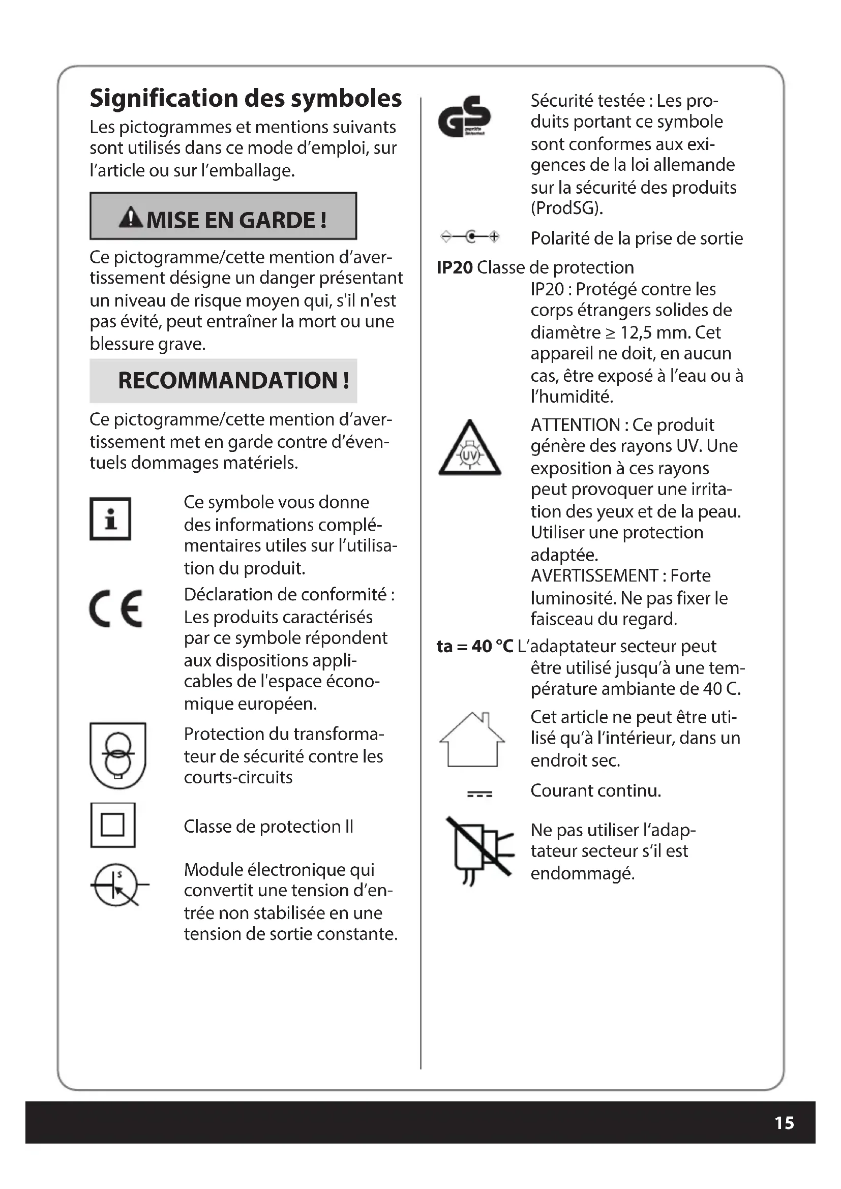 Signification des symboles Les pictogrammes et mentions suivants sont utilisés dans ce mode d’emploi, sur l’article ou sur l’emballage. MISE EN GARDE! Ce pictogramme/cette mention d’aver- tissement désigne un danger présentant un niveau de risque moyen qui, s'il n'est pas évité, peut entraîner la mort ou une blessure grave. RECOMMANDATION! Ce pictogramme/cette mention d’aver- tissement met en garde contre d’éven- tuels dommages matériels. Ce symbole vous donne des informations complé- mentaires utiles sur l’utilisa- tion du produit. Déclaration de conformité: Les produits caractérisés par ce symbole répondent aux dispositions appli- cables de l'espace écono- mique européen. Protection du transforma- teur de sécurité contre les courts-circuits Classe de protection II Module électronique qui convertit une tension d’en- trée non stabilisée en une tension de sortie constante. Sécurité testée: Les pro- duits portant ce symbole sont conformes aux exi- gences de la loi allemande sur la sécurité des produits (ProdSG). Polarité de la prise de sortie IP20 Classe de protection IP20: Protégé contre les corps étrangers solides de diamètre ≥ 12,5 mm. Cet appareil ne doit, en aucun cas, être exposé à l’eau ou à l’humidité. ATTENTION : Ce produit génère des rayons UV. Une exposition à ces rayons peut provoquer une irrita- tion des yeux et de la peau. Utiliser une protection adaptée.