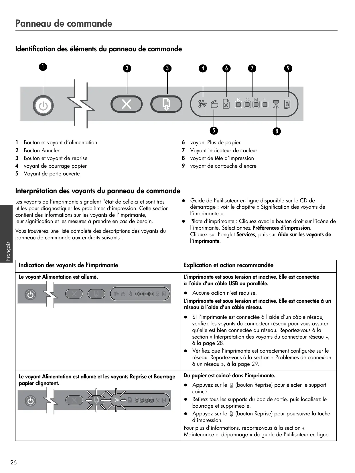 Interprétation des voyants du panneau de commande Les voyants de l’imprimante signalent l’état de celle-ci et sont très utiles pour diagnostiquer les problèmes d’impression. Cette section contient des informations sur les voyants de l’imprimante, leur signification et les mesures à prendre en cas de besoin.