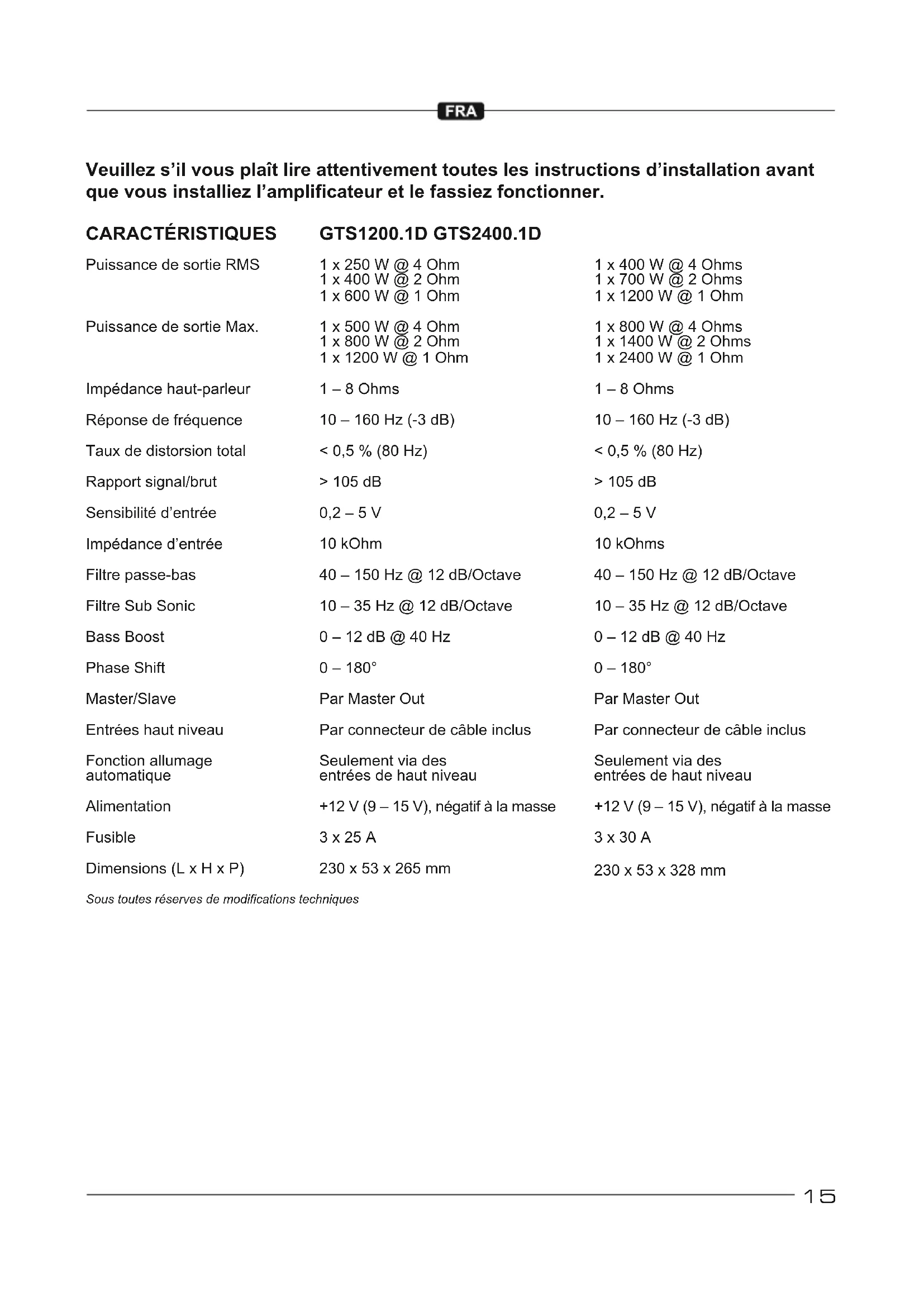 LaPOWER/PROTECTIONLED(Fig.1,1)s’éclaireenvert,sil´amplicateurestenmarche. LaPOWER/PROTECTIONLED(Fig.1,1)s´éclaireenrougequandl´ampliestensurchauffe,oulorsqu’unun courtcircuitestresponsabled´uneimpédancetropbassedanslaconnexiondeshautsparleurs.Danscecas, le circuit de protection intégré éteint automatiquement l’amplicateur. L’amplicateurdevraitre-fonctionner lorsquevousaurezrésolule/lesproblème(s). OPÉRATION MASTER/SLAVE / 2 x GTS1200.1D/GTS2400.1D (FIG. 5a - 5c) Sivousvoulezutiliserunamplicateur1(MASTER)aveclesdeuxcanauxdesortiesdelignedelasource principaleetl´amplicateur2supplémentaire(SLAVE)celadoitfonctionnervialasortiejackOUTMASTER (Fig. 1,9), pour cela connecter de la façon suivante: (1) Commandeàdistancedebasses (2) Vers l’autoradio, sortie gauche (3) Vers l’autoradio, sortie droite (4) Connexion RCA entre MASTER et SLAVE Sichacundesamplicateursdoitalimenterunsubwoofer,connecterdelafaçonsuivante: (5) Subwoofer 1 (1 - 8 Ohm) (6) Subwoofer2(1-8Ohm),connectéaveclapolaritéinversedecelledel´amplicateurSALVE(–à+). Silesdeuxamplicateursdoiventalimenterunsubwooferensemble,connecterdelafaçonsuivante: (7) Subwoofer (2-8 Ohms) (8) Lesubwooferdoitêtreconnectéaveclapolaritéinversedecelledel´amplicateurSLAVE(–à+) (9) MASTERetSLAVEdoiventêtretoutlesdeuxconnectésauxterminauxdeshaut-parleursplus/moins. IMPORTANT! Respecteztoujourslapolaritédetouteslesconnexions!20 DÉPANNAGE Sivouséprouvezdesdifcultésaprèsl’installation,appliquezlesprocéduresdedépannageci-dessous. Procédure 1:Vériezquelesconnexionsdel’amplisontbienmises. VériezquelePOWER/PROTECTIONLEDestalluméenvert.Sic‘estlecase,passezàl‘étape3,sinonpoursuivez.