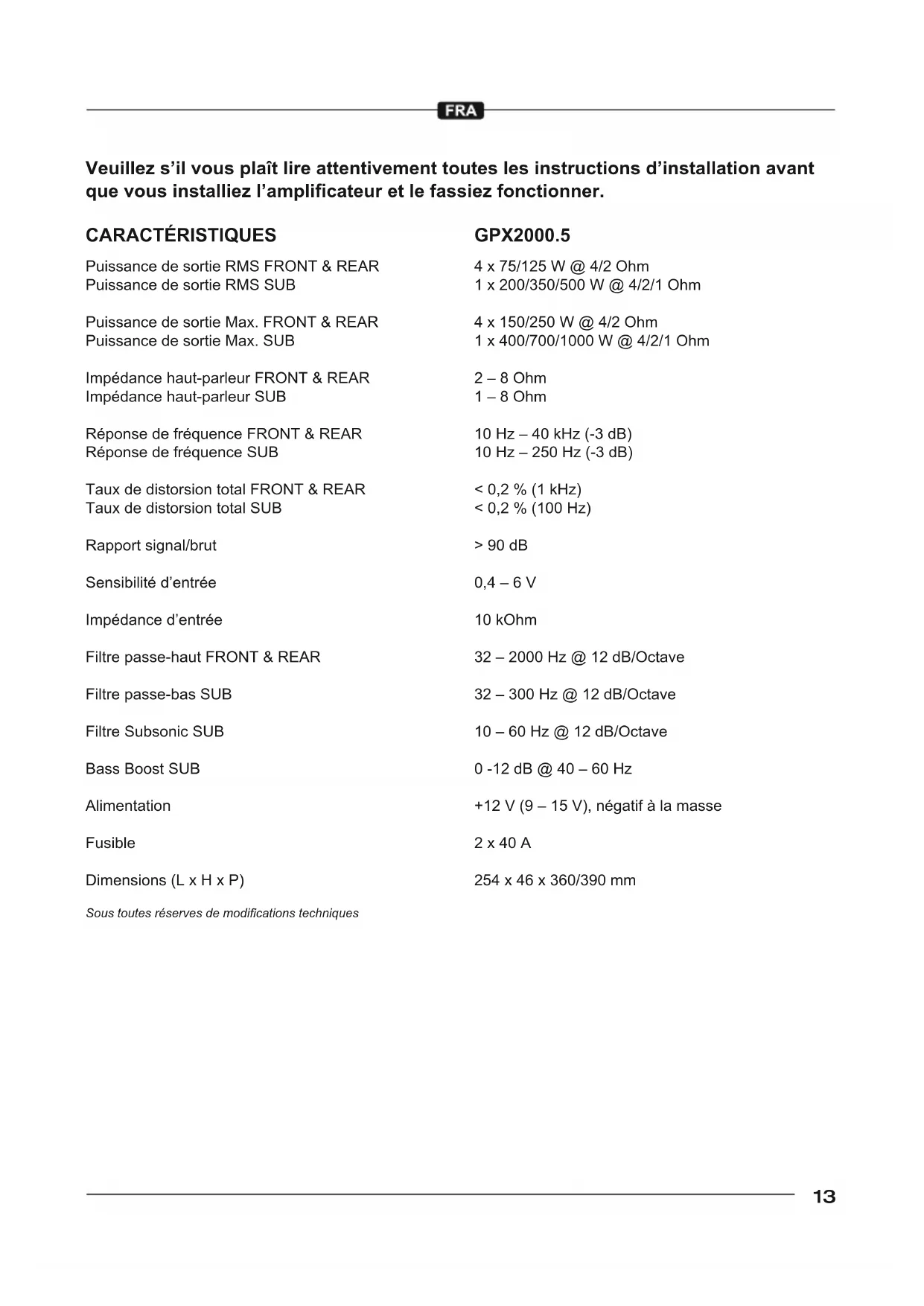 Puissance de sortie Max. FRONT & REAR Puissance de sortie Max. SUB