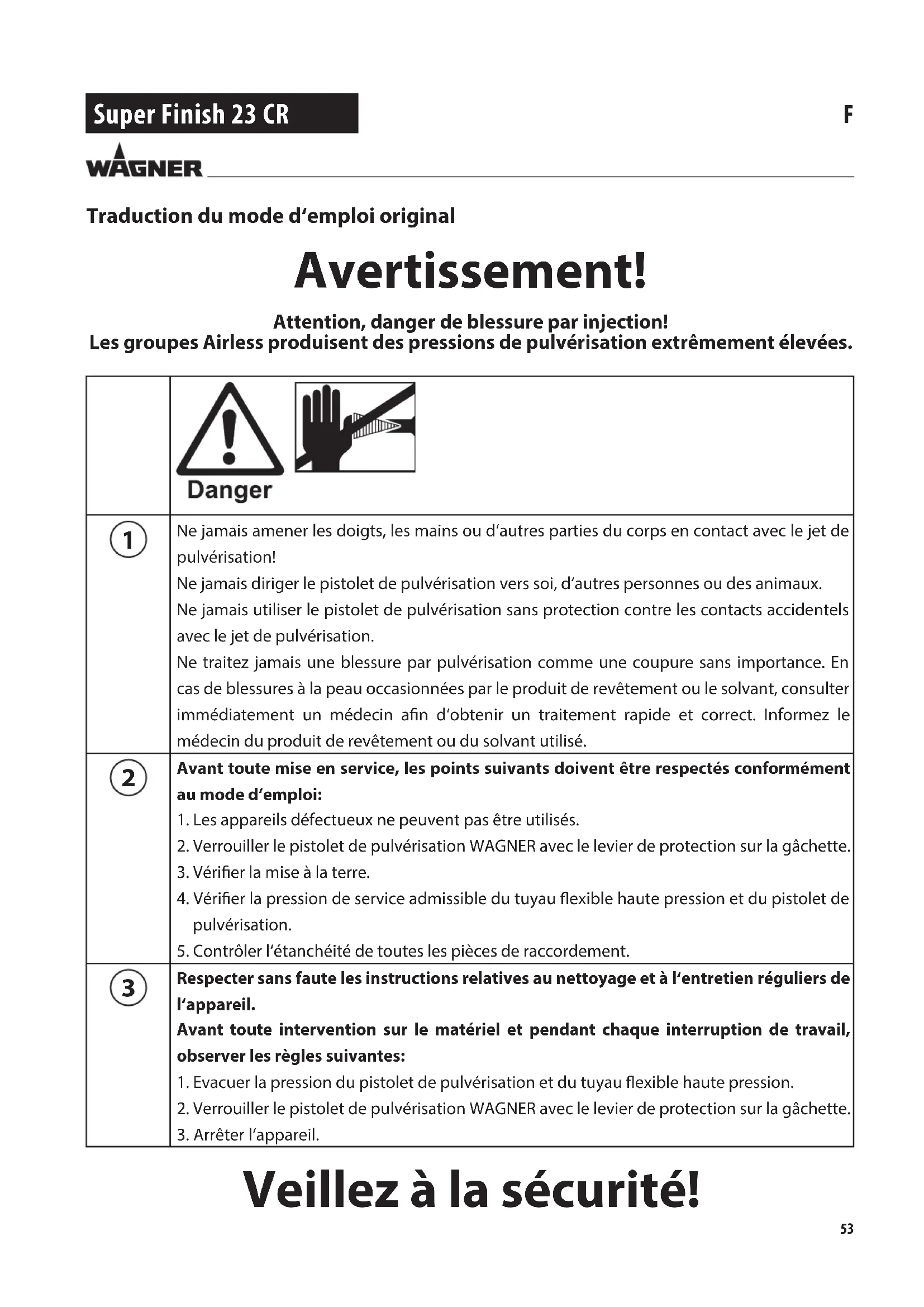 Ne jamais amener les doigts, les mains ou d‘autres parties du corps en contact avec le jet de pulvérisation!Ne jamais diriger le pistolet de pulvérisation vers soi, d‘autres personnes ou des animaux.Ne jamais utiliser le pistolet de pulvérisation sans protection contre les contacts accidentels avec le jet de pulvérisation.Ne traitez jamais une blessure par pulvérisation comme une coupure sans importance. En cas de blessures à la peau occasionnées par le produit de revêtement ou le solvant, consulter immédiatement un médecin an d‘obtenir un traitement rapide et correct. Informez le médecin du produit de revêtement ou du solvant utilisé. Avant toute mise en service, les points suivants doivent être respectés conformément au mode d‘emploi:1. Les appareils défectueux ne peuvent pas être utilisés.2. Verrouiller le pistolet de pulvérisation WAGNER avec le levier de protection sur la gâchette.3. Vérier la mise à la terre.4. Vérier la pression de service admissible du tuyau exible haute pression et du pistolet de pulvérisation.5. Contrôler l‘étanchéité de toutes les pièces de raccordement. Respecter sans faute les instructions relatives au nettoyage et à l‘entretien réguliers de l‘appareil.Avant toute intervention sur le matériel et pendant chaque interruption de travail, observer les règles suivantes:1. Evacuer la pression du pistolet de pulvérisation et du tuyau exible haute pression.2. Verrouiller le pistolet de pulvérisation WAGNER avec le levier de protection sur la gâchette.3. Arrêter l‘appareil. Veillez à la sécurité! Traduction du mode d‘emploi original54 Super Finish 23 CR