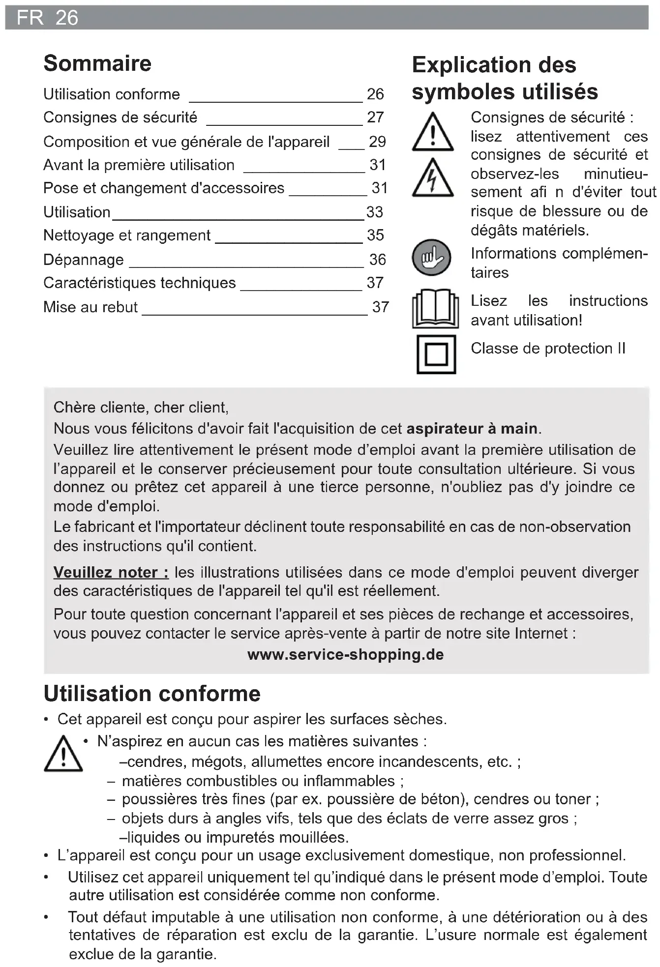 - Tout défaut imputable à une utilisation non conforme, à une détérioration ou à des tentatives de réparation est exclu de la garantie. L’usure normale est également exclue de la garantie. Explication des symboles utilisés Consignes de sécurité : lisez attentivement ces consignes de sécurité et observez-les minutieu- sement afi n d'éviter tout risque de blessure ou de dégâts matériels. Informations complémen- taires Lisez les instructions avant utilisation! Classe de protection II Chère cliente, cher client, Nous vous félicitons d'avoir fait l'acquisition de cet aspirateur à main. Veuillez lire attentivement le présent mode d’emploi avant la première utilisation de l’appareil et le conserver précieusement pour toute consultation ultérieure. Si vous donnez ou prêtez cet appareil à une tierce personne, n'oubliez pas d'y joindre ce mode d'emploi. Le fabricant et l'importateur déclinent toute responsabilité en cas de non-observation des instructions qu'il contient. Veuillez noter : les illustrations utilisées dans ce mode d'emploi peuvent diverger des caractéristiques de l'appareil tel qu'il est réellement. Pour toute question concernant l'appareil et ses pièces de rechange et accessoires, vous pouvez contacter le service après-vente à partir de notre site Internet : www.service-shopping.de27 FR Consignes de sécurité ■ Cet appareil peut être utilisé par les enfants à partir de 8 ans et les personnes dont les capacités physiques, sensorielles ou mentales sont réduites ou manquant d’expérience et/ou de connaissances lorsqu’elles sont sous surveillance ou qu’elles ont été instruites quant à l’utilisation de l’appareil en toute sécu- rité et qu’elles ont compris les risques en découlant. ■ Les enfants ne doivent pas jouer avec l’appareil. ■ Le nettoyage et l’entretien utilisateur ne doivent pas être réalisés par les enfants sauf s’ils ont plus de 8 ans et qu’ils sont sous surveillance. ■ Tenez l’appareil et son cordon d’alimentation hors de portée des animaux et des enfants de moins de 8 ans. ■ Il convient de surveiller les enfants pour s’assurer qu’ils ne jouent pas et/ou ne se blessent pas avec l’appareil. ■ L’appareil doit être utilisé et rangé hors de portée des enfants et des animaux. Une utilisation inadéquate risque de causer des blessures ou une électrocution. Le cordon d’alimentation doit également être mis hors de portée des enfants et des animaux. ■ L’appareil doit toujours être débranché du secteur lorsqu’il n’est pas sous surveillance, avant d’être assemblé, démonté ou nettoyé. ■ Rechargez les accus uniquement à l’aide du bloc d’alimentation fourni. Ne rechargez aucun autre appareil avec le bloc d’alimen- tation fourni. ■ Ne plongez jamais l’appareil, le cordon d’alimentation et la fi che dans l’eau ou tout autre liquide et assurez-vous qu’ils ne risquent pas de tomber dans l’eau ou d’être mouillés. ■ Si l’appareil lui-même, son cordon d’alimentation ou sa fi che sont endommagés, c’est au fabricant, au service après-vente ou à toute personne aux qualifi cations similaires (par ex. un atelier spécialisé) qu’il revient de le réparer afi n d’éviter tout danger. Risques de blessure ■ Ne laissez pas l’appareil et son emballage à la portée des enfants ou des animaux. Ils risqueraient de se blesser et de s’étouffer avec ! ■ N’utilisez pas l’appareil lorsqu’il est endommagé.FR 28 ■ Veillez à maintenir les suceurs à une distance suffi sante du corps et des animaux. Sous l’effet de l’aspiration, ceux-ci risqueraient d’adhérer fermement à l’appareil. Toutefois, si l’aspirateur fait ventouse et ne se décolle plus, arrêtez immédiatement l’appareil avec l’interrupteur marche/arrêt. Risque d’électrocution et risque d’incendie ■ Branchez l’appareil uniquement sur une prise installée de façon réglementaire et mise à la terre. La prise doit rester facilement accessible même après le branche- ment de sorte à pouvoir rapidement couper l’alimentation de l’appareil. La tension du secteur doit correspondre aux caractéristiques techniques de l’appareil. Utilisez uniquement des rallonges conformes dont les caractéristiques techniques corres- pondent à celles de l’appareil. ■ Si l’appareil tombe dans l’eau, coupez immédiatement l’alimentation électrique. N’essayez pas d’extraire l’appareil de l’eau tant qu’il est encore raccordé au réseau électrique ! ■ Ne saisissez jamais l’appareil, le cordon d’alimentation et la fi che à mains humides lorsque ces composants sont raccordés au réseau électrique. ■ Arrêtez l’appareil et retirez la fi che de la prise de courant ! – lorsque vous interrompez votre travail avec l’appareil ; – avant un orage ; – en cas de défaillance ou de panne pendant le fonctionnement de l’appareil ; – lorsque des corps étrangers ont pénétré dans l’appareil. ■ Pour débrancher l’appareil, tirez toujours sur la fi che, jamais sur le cordon ! ■ Utilisez l’appareil uniquement dans une pièce fermée. ■ N’utilisez pas l’appareil dans des locaux renfermant des poussières facilement in- fl ammables ou des vapeurs nocives ou explosives. ■ Risque d’incendie ! Ne faites pas fonctionner l’appareil dans un environnement très humide ni à proximité de matières infl ammables. Évitez les détériorations de l’appareil et du matériel ! ■ Afi n que personne ne risque de trébucher, faites cheminer le cordon du bloc d’ali- mentation de sorte qu’il ne gêne pas le passage. ■ Veillez à ce que le cordon ne soit ni pincé, ni coincé, ni posé sur des bords saillants et qu’il n’entre pas en contact avec des surfaces chaudes. ■ Afi n d’éviter les détériorations de l’appareil, veillez à le placer à une distance suf- fi sante de toute source de chaleur, comme des plaqu