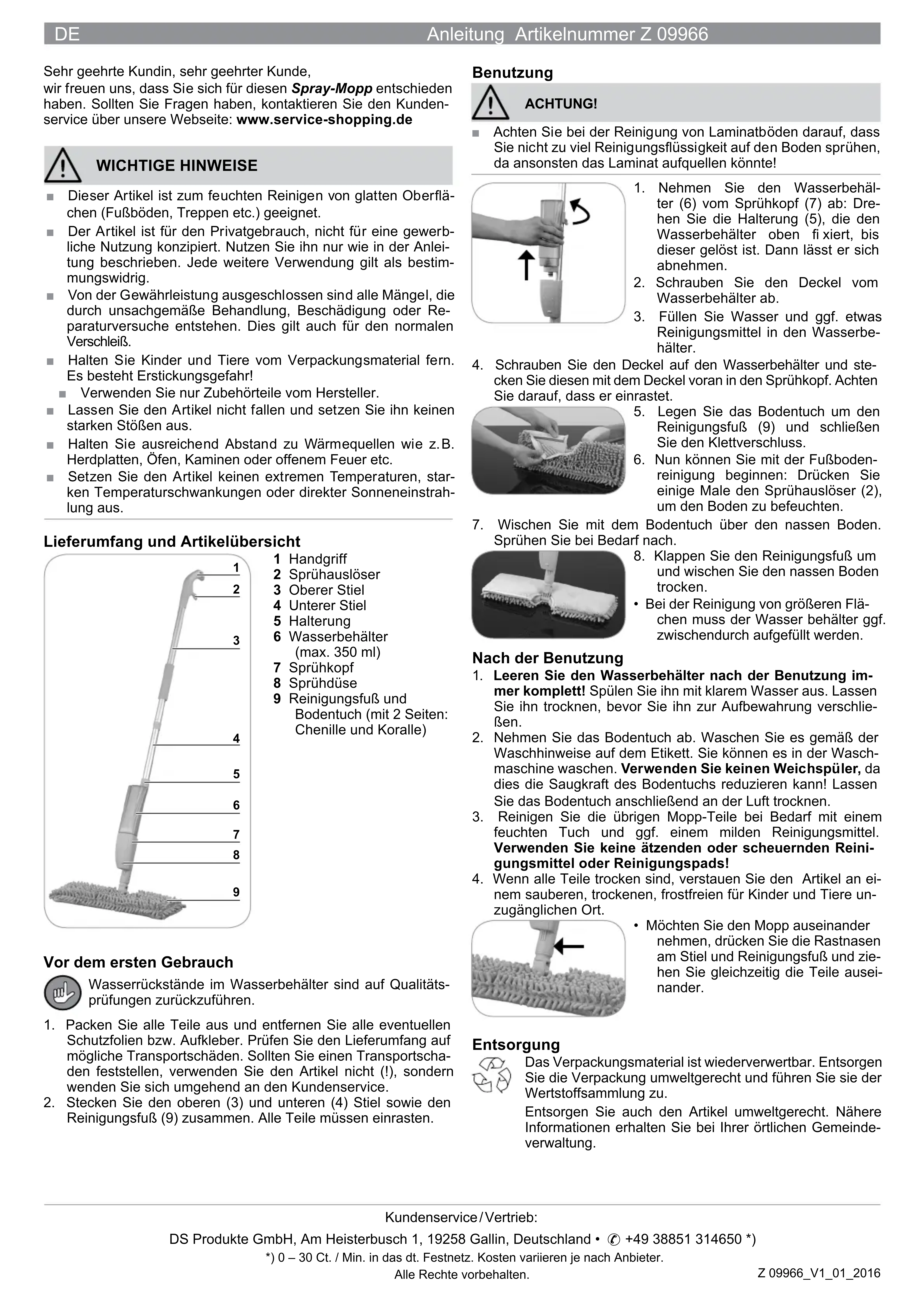 +49 38851 314650 *) *) Appel payant. Coût variable selon le prestataire. Tous droits réservés. Chère cliente, cher client, Nous vous félicitons d'avoir fait l'acquisition de ce balai vaporisa- teur. Pour toute question, contactez le service après-vente à partir de notre site Internet : www.service-shopping.de REMARQUES IMPORTANTES ■ Cet article sert au nettoyage humide de surfaces lisses (sols, escaliers, etc.). ■ L'article est conçu pour un usage exclusivement domestique, non professionnel. Il doit être utilisé uniquement tel qu'indiqué dans le présent mode d'emploi. Toute autre utilisation est consi- dérée comme non conforme. ■ Tout défaut imputable à une utilisation non conforme, à une détérioration ou à des tentatives de réparation est exclu de la garantie. L’usure normale est également exclue de la garantie. ■ Ne laissez pas les emballages à la portée des enfants ou des animaux. Risque de suffocation ! ■ Utilisez uniquement les accessoires du fabricant. ■ Ne faites pas tomber l'article et ne lui faites pas subir de chocs violents. ■ Assurez-vous de le maintenir à une distance suffi sante de toute source de chaleur, comme par ex. des plaques de cuisson, d'un four, d'une cheminée ou de toute fl amme ouverte, etc.. ■ N'exposez pas l'article à des températures extrêmes, à de fortes variations de température, ni au rayonnement direct du soleil. Composition et vue générale de l'article 1 Poignée de préhension 2 Gâchette du pistolet 3 Manche supérieur 4 Manche inférieur 5 Support 6 Réservoir d'eau (max. 350 ml) 7 Tête de vaporisation 8 Buse de vaporisation 9 Pied de nettoyage et lingette (avec 2 côtés : chenille et corail) Avant la première utilisation Les résidus d'eau dans le réservoir d’eau proviennent des tests de qualité effectués.