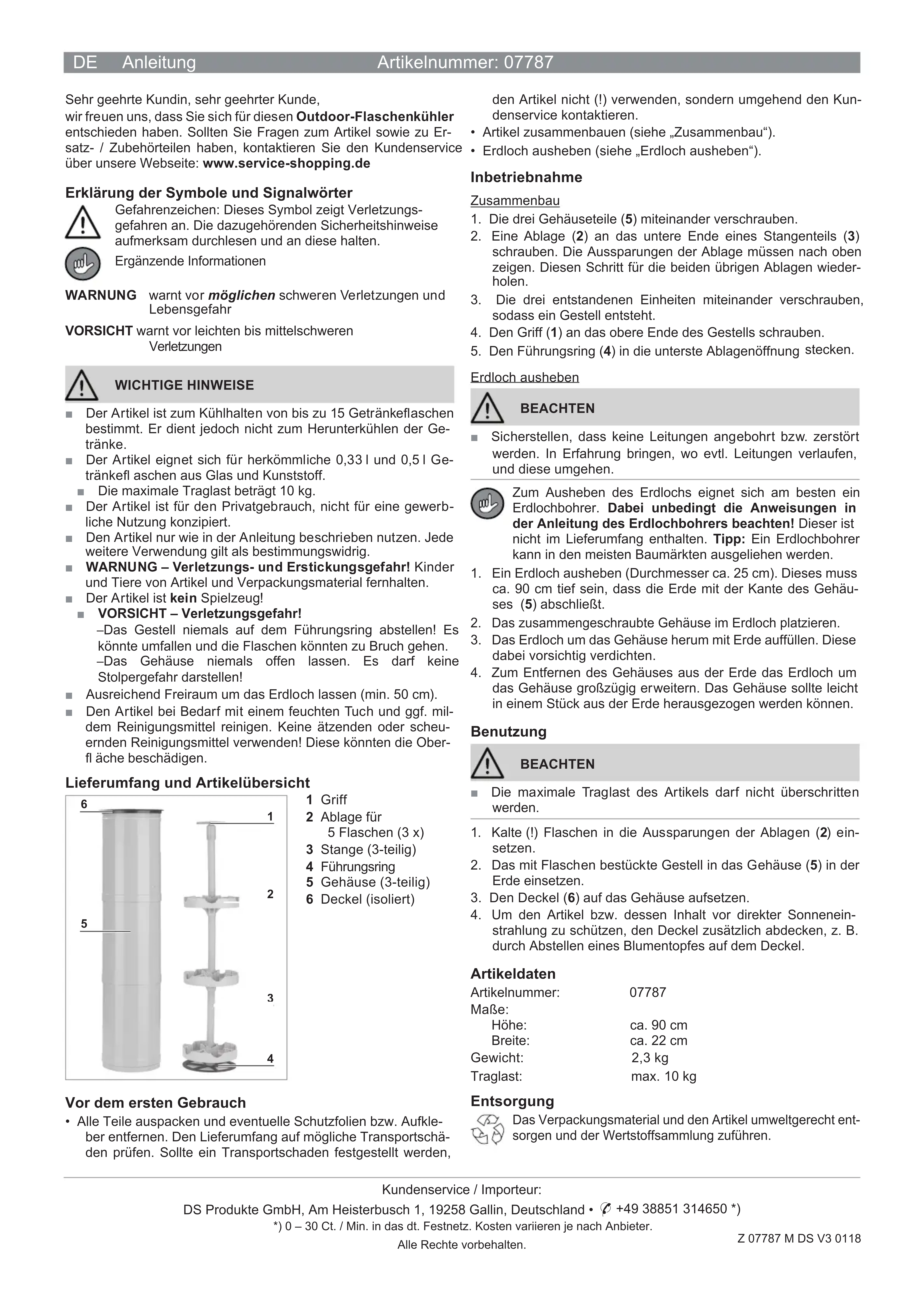 cover the lid, e. g. by placing a fl ower pot on top of the lid. Article Data Article number: 07787 Dimensions: Height: approx. 90 cm Width: approx. 22 cm Weight: 2.3 kg Load capacity: max. 10 kg Disposal Dispose of the packaging material and the article in an en- vironmentally friendly manner and take them to a recycling centre. Z 07787 M DS V3 0118FR Mode d’emploi Service après-vente / importateur : DS Produkte GmbH, Am Heisterbusch 1, 19258 Gallin, Allemagne • ✆ +49 38851 314650 *) *) Prix d’un appel vers le réseau fi xe allemand. Coût variable selon le prestataire. Tous droits réservés. Référence article : 07787 Chère cliente, cher client, Nous vous félicitons d’avoir fait l’acquisition de ce porte-bou- teilles isotherme d’extérieur. Pour toute question concernant l’article et ses pièces de rechange et accessoires, vous pouvez contacter le service après-vente à partir de notre site Internet : www.service-shopping.de Explication des symboles utilisés et des mentions d’avertissement Mention de danger : ce symbole indique les risques de blessures. Lisez et observez attentivement les consignes de sécurité correspondantes. Informations complémentaires AVERTIS- SEMENT Vous alerte devant le risque potentiel de blessures graves et mortelles ATTENTION Vous alerte devant le risque de blessures bénignes ou de moyenne gravité REMARQUES IMPORTANTES ■ Cet article est destiné à maintenir jusqu’à 15 bouteilles de bois- sons au frais. Toutefois, il ne permet pas de refroidir les boissons. ■ L’article peut accueillir des bouteilles de boissons courantes de 0,33 l et 0,5 l en verre et plastique. ■ La capacité de charge maximale est de 10 kg. ■ L’article est conçu pour un usage exclusivement domestique, non professionnel. ■ Cet article doit être utilisé uniquement tel qu’indiqué dans le présent mode d’emploi. Toute autre utilisation est considérée comme non conforme. ■ AVERTIS SEMENT – Risque de suffocation et de bles- sures ! Ne laissez pas l’article et son emballage à la portée des enfants ou des animaux. ■ Cet article n’est pas un jouet ! ■ ATTENTION – Risque de blessure ! – Ne déposez jamais la structure sur la bague de guidage ! Elle risquerait de chuter et les bouteilles pourraient se briser. – Ne laissez jamais le boîtier ouvert. Risque de trébucher ! ■ Prévoyez un espace suffi sant autour du trou dans la terre (50 cm min.). ■ Si nécessaire, nettoyez l’article avec un chiffon humide et éventuellement un peu de détergent doux. N’utilisez pas de produits de nettoyage corrosifs ou abrasifs ! De tels produits risqueraient d’endommager la surface de l’article. Composition et vue générale de l’article 1 Poignée 2 Plateau pour 5 bouteilles (3 x) 3 Tige (3 parties) 4 Bague de guidage 5 Boîtier (3 parties) 6 Couvercle (isolé)