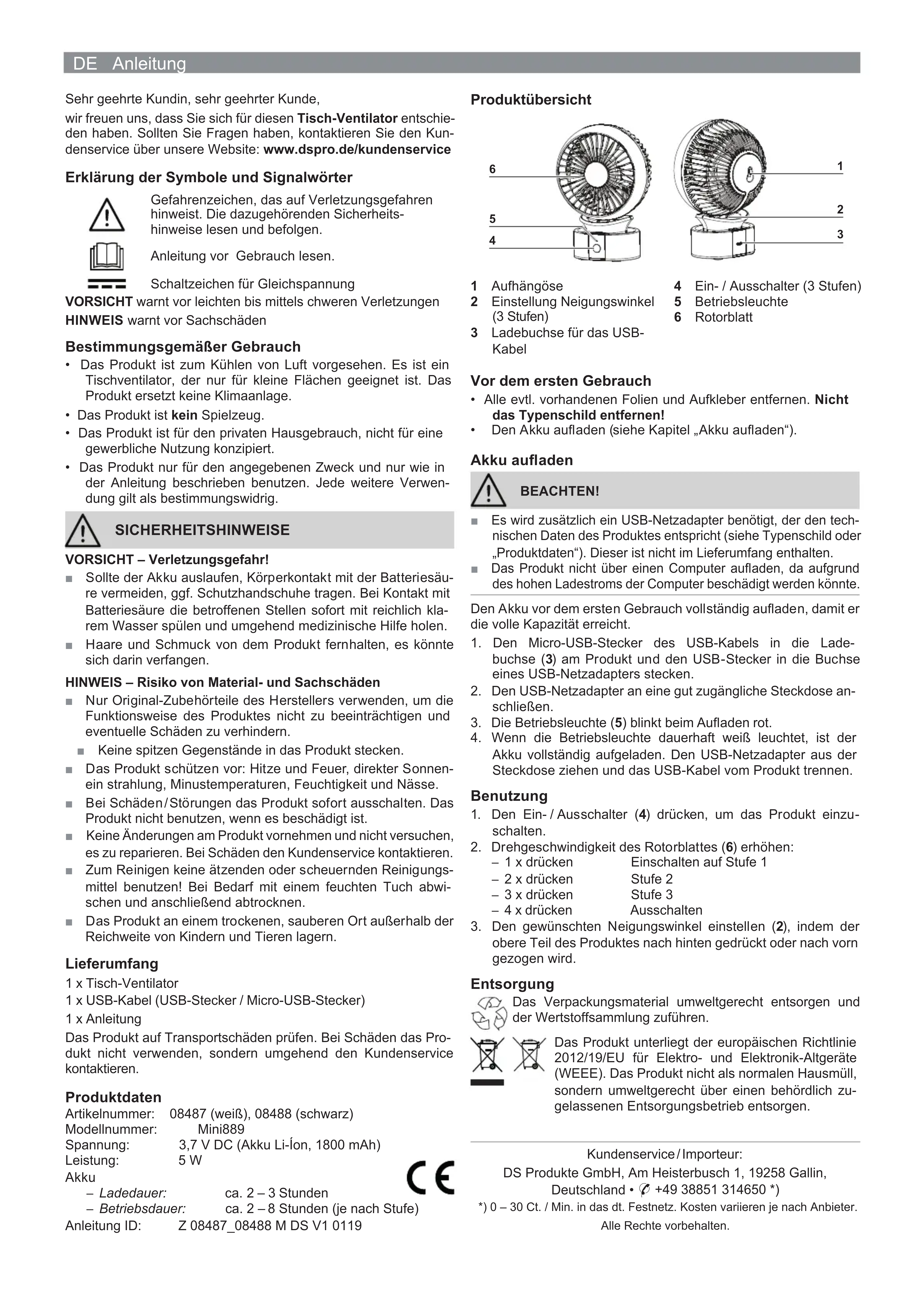 product back or pulling it forward. Disposal Dispose of packaging materials in an environmentally sound way and take recyclables to collection facilities. This product is subject to European Directive 2012/19/EU on Waste Electrical and Electronic Equipment (WEEE). Do not dispose of the product as normal household waste, but through an offi cially approved disposal business according to environ- mental regulations.FR Mode d’emploi Service après-vente / importateur : DS Produkte GmbH, Am Heisterbusch 1, 19258 Gallin, Allemagne • ✆ +49 38851 314650 *) *) Prix d‘un appel vers le réseau fi xe allemand. Coût variable selon le prestataire. Tous droits réservés. Chère cliente, cher client, Nous vous remercions d’avoir choisi ce ventilateur de table. Pour toute question, contactez notre service après-vente via notre site Internet : www.dspro.de/kundenservice Signifi cation des symboles et des termes d’avertissement Symbole de danger indiquant un risque de blessure. Lire les consignes de sécurité correspondantes et s’y conformer. Lire le mode d’emploi avant toute utilisation. Symbole de circuit en tension continue ATTENTION avertit d’un risque de blessures légères à modérées AVIS avertit d’un risque de dégâts matériels Usage conforme