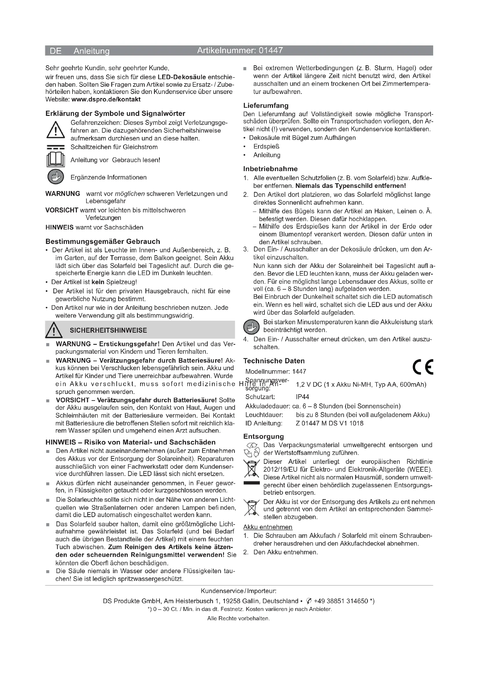 Caractéristiques techniques Numéro de modèle : 1447 Alimentation : 1,2 V CC (1 batterie Ni-MH, type AA, 600 mAh) Indice de protection : IP44 Durée de charge de la batterie : env. 6 – 8 heures (par beau temps) Durée d’éclairage : jusqu’à 8 heures (avec une batterie entièrement chargée) ID du mode d’emploi : Z 01447 M DS V1 1018 Mise au rebut Mettre au rebut l’emballage dans le respect de l’environne- ment en le jetant dans un bac de recyclage. Cet article est conforme à la directive européenne 2012/19/ UE relative aux déchets d’équipements électriques et électroniques (DEEE). Il ne doit pas être jeté parmi les déchets ménagers ordinaires, mais éliminé dans le respect de l’environnement via une usine de traitement des déchets agréée. La batterie doit être retirée avant la mise au rebut du produit puis déposée séparément dans un point de collecte dédié. Retrait de la batterie