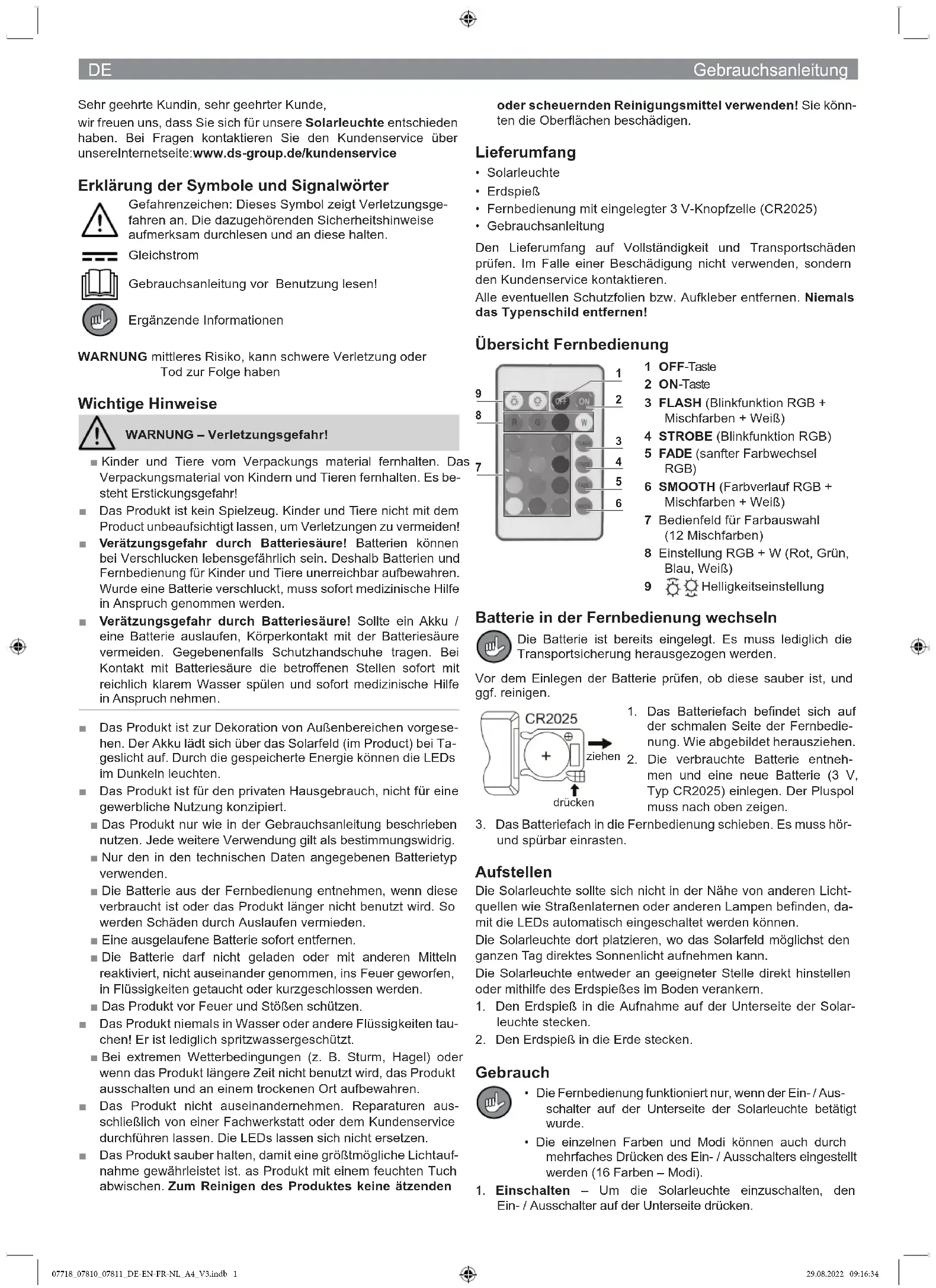 On / O switch on the bottom for approx. 3 seconds. Technical Data Power supply: 3,7 V DC (1x storage battery Li-Ion ICR18650, 1800 mAh) Power: max. 2 W Charging time: approx. 6 to 8 hours (in sunlight) Lighting time: up to 8 hours (with a fully charged storage battery) Type of protection: IP67 ID operating nstructions: Z 07718_07810_07811 M DS V3 0822 mh Variations Produit number Shape Model number 07718 cube SG101 07810 ball SG9011 07811 stone SG9025 push pull Produit number: 07810 / 07811 EN Operating instructions Customer Service / Importer: DS Produkte GmbH, Am Heisterbusch 1, 19258 Gallin, Germany • ✆ +49 38851 314650 *) *) Calls to German landlines are subject to your provider’s charges. All rights reserved. 07718_07810_07811_DE-EN-FR-NL_A4_V3.indb 307718_07810_07811_DE-EN-FR-NL_A4_V3.indb 3 29.08.2022 09:16:3429.08.2022 09:16:34Chère cliente, cher client, Nous nous réjouissons que vous ayez décidé d’acheter nos lampe solaire. Pour toute question, contactez notre service après-vente via notre site Internet : www.ds-group.de/kundenservice Des symboles / mentions d’avertissement Symbole de danger : Ce symbole indique un risque de blessure. Lire attentivement les consignes de sécurité correspondantes et s’y conformer. Courant continu Veuillez lire le présent mode d'emploi avant utilisation ! AVERTISSEMENT Risque moyen pouvant induire des blessures graves, voire mortelles Remarques importantes AVERTISSEMENT – Risque de blessures! ■ Tenir l’emballage hors de portée des enfants et des animaux. Risque de suocation ! ■ Cet produit n’est pas un jouet. An d’éviter toute blessure, ne laissez pas les enfants ni les animaux sans surveillance à proximité de cet produit. ■ Risque de brûlures causées par l’électrolyte des piles ! Les piles peuvent être mortelles si elles sont avalées. Pour cette raison, rangez les piles et la télécommande hors de por- tée des enfants et des animaux. Si une pile a été avalée, il faut immédiatement demander conseil à un médecin. ■ Risque de brûlures causées par l’électrolyte des piles ! Si une pile / une batterie fuit, évitez tout contact corporel avec l’électrolyte. Le cas échéant, portez des gants de protection. En cas de contact avec l’électrolyte, rincez immédiatement et abondamment à l’eau claire les zones touchées, puis deman- dez conseil à un médecin. ■ Le produit est destiné à décorer l’extérieur. La batterie se charge à la lumière du jour avec le panneau solaire (dans l’pro- duit). Grâce à l’énergie accumulée, les DEL peuvent s’allumer dans l’obscurité. ■ Le produit est conçu pour un usage exclusivement domestique, non professionnel. ■ Le produit doit être utilisé uniquement tel qu’indiqué dans le présent mode d’emploi. Toute autre utilisation est considérée comme non conforme. ■ N’utiliser que le type de piles indiqué dans les données techniques. ■ Retirer la pile de la télécommande si elle est usée ou l’produit n’est pas utilisé sur une période prolongée. Ceci permet d’évi- ter des dommages causés par des piles qui coulent. ■ Immédiatement retirer une pile qui fuit. ■ Il est interdit de charger la pile ou de la réactiver par d’autres moyens, il est interdit de la démonter, de la jeter dans le feu, de la plonger dans des liquides ou de la court-circuiter. ■ Veillez à ce que le produit ne soit pas soumis à des chocs ; maintenez-le loin de toute amme et source de chaleur. ■ N’immergez jamais le produit dans l’eau ou tout autre liquide. Il est seulement doté d’une protection anti-éclaboussures. ■ Dans des conditions météorologiques extrêmes (par ex. en cas de tempête ou d’orage de grêle) ou lorsque le produit n’est pas utilisé pendant une période prolongée, éteignez-le et rangez-le dans un endroit sec. ■ Ne démontez pas le produit ! Faites eectuer les réparations exclusivement par un atelier spécialisé ou par le service après- vente. Les DEL ne se remplacent pas. ■ Veillez à garder l’produit propre de sorte qu’il puissent absor- ber un maximum de lumière. Essuyez-le à l’aide d’un chion humide. Pour le nettoyage, n’utilisez pas de produits cor- rosifs ou abrasifs ! De tels produits risqueraient d’en endom- mager la surface. Composition