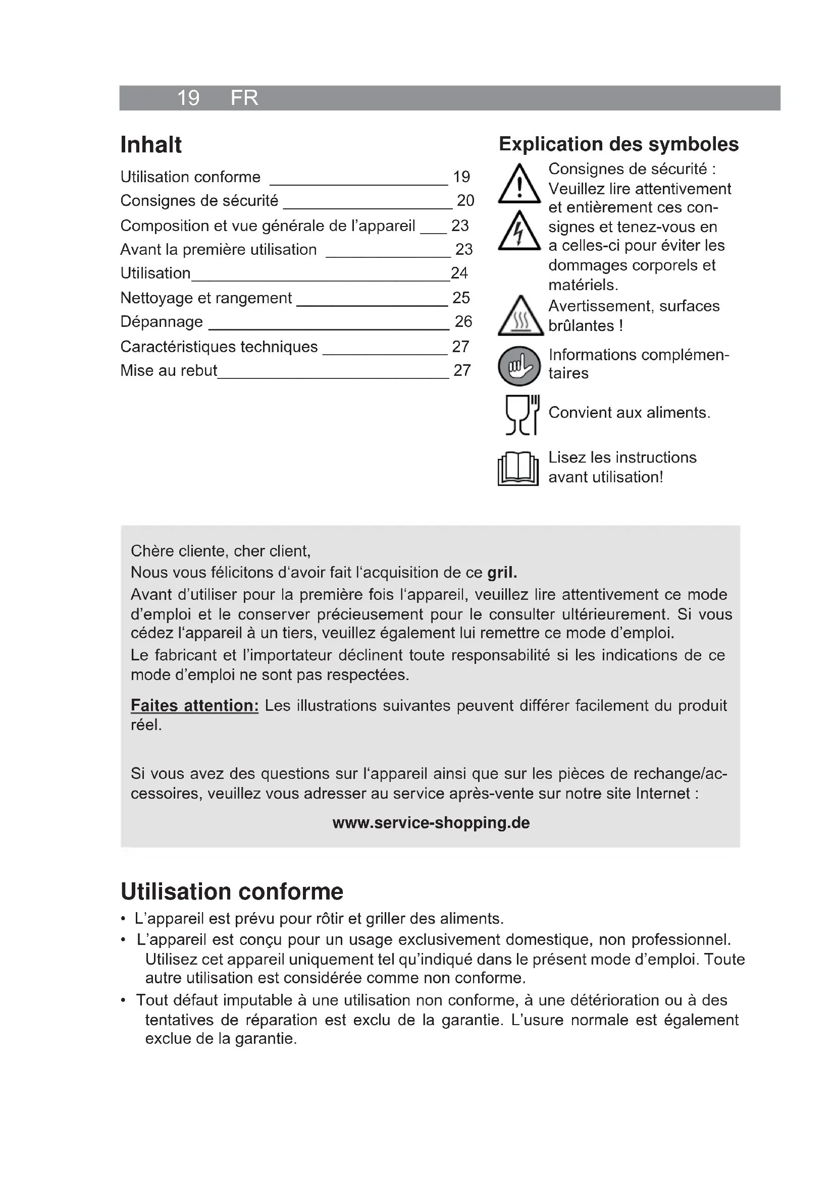 - Tout défaut imputable à une utilisation non conforme, à une détérioration ou à des tentatives de réparation est exclu de la garantie. L’usure normale est également exclue de la garantie. Inhalt Utilisation conforme ____________________ 19 Consignes de sécurité ___________________ 20 Composition et vue générale de l’appareil ___ 23 Avant la première utilisation ______________ 23 Uti lisati on _____________________________ 24 Nettoyage et rangement _________________ 25 Dépannage ___________________________ 26 Caractéristiques techniques ______________ 27 Mise au rebut __________________________ 27 Explication des symboles Consignes de sécurité : Veuillez lire attentivement et entièrement ces con- signes et tenez-vous en a celles-ci pour éviter les dommages corporels et matériels. Avertissement, surfaces brûlantes ! Informations complémen- taires Convient aux aliments. Lisez les instructions avant utilisation! Chère cliente, cher client, Nous vous félicitons d‘avoir fait l‘acquisition de ce gril. Avant d’utiliser pour la première fois l‘appareil, veuillez lire attentivement ce mode d’emploi et le conserver précieusement pour le consulter ultérieurement. Si vous cédez l‘appareil à un tiers, veuillez également lui remettre ce mode d’emploi. Le fabricant et l’importateur déclinent toute responsabilité si les indications de ce mode d’emploi ne sont pas respectées. Faites attention: Les illustrations suivantes peuvent différer facilement du produit réel. Si vous avez des questions sur l‘appareil ainsi que sur les pièces de rechange/ac- cessoires, veuillez vous adresser au service après-vente sur notre site Internet : www.service-shopping.deFR 20 Consignes de sécurité ■ Cet appareil peut être utilisé par les enfants à partir de 8 ans et les personnes dont les capacités physiques, sensorielles ou mentales sont réduites ou manquant d’expérience et/ou de connaissances lorsqu’elles sont sous surveillance ou qu’elles ont été instruites quant à l’utilisation de l’appareil en toute sécu- rité et qu’elles ont compris les risques en découlant. ■ Les enfants ne doivent pas jouer avec l’appareil. ■ Le nettoyage et l’entretien utilisateur ne doivent pas être réalisés par les enfants sauf s’ils ont plus de 8 ans et qu’ils sont sous surveillance. ■ Tenez l’appareil et son cordon d’alimentation hors de portée des animaux et des enfants de moins de 8 ans. Attention aux surfaces chaudes ! À l’utilisation, l’appa- reil devient très chaud. Veillez impérativement à ne pas en- trer en contact avec des parties chaudes pendant ou après l’utilisation de l’appareil. Lorsque l’appareil fonctionne ou immédiatement après l’avoir arrêté, seuls les poignées peuvent être saisis. Nous recommandons d’utiliser des maniques pour mani- puler l’appareil. Procédez au transport et au nettoyage de l’appareil seule- ment après son refroidissement. Il est interdit de déplacer l’appareil lorsqu’il est en marche. ■ L’appareil doit toujours être débranché du secteur lorsqu’il n’est pas sous surveillance, avant d’être assemblé, démonté ou net- toyé. ■ Avant chaque utilisation, vérifi ez que l’appareil ne présente au- cun dommage. L’appareil ne doit pas être utilisé si le cordon, la fi che ou l’appareil lui-même présente des dommages apparents. N’utilisez pas l’appareil en cas de dysfonctionnement ou s’il est tombé. Faites-le contrôler par un service de maintenance agréé. ■ N’effectuez aucune modifi cation sur l’appareil. Ne remplacez jamais vous-même le cordon d’alimentation. Lorsque l’appareil, le cordon d’alimentation ou la prise de l’appareil sont endom- magés, il faut les faire remplacer par le fabricant ou le service21 FR après-vente ou une personne qualifi ée (p. ex. un atelier profes- sionnel) pour éviter tout risque. ■ L’appareil n’est pas destiné à fonctionner avec une minuterie ex- terne ou avec un système de télécommande séparé. ■ ATTENTION, respectez les consignes sur le nettoyage données au paragraphe « Nettoyage et rangement ». Risques de blessure ■ Tenez les enfants et les animaux éloignés de l’appareil et du matériel d’emballage ! Il y a risque de blessure et d’asphyxie. ■ ATTENTION, risque de brûlures dues à la chaleur et la vapeur chaude ! Pen- dant le fonctionnement, de la vapeur brûlante peut s’échapper de l’appareil. Pour cette raison, tenez votre visage et vos mains éloignés de la zone dangereuse. ■ Laisser suffi samment refroidir l’appareil avant de le nettoyer et / ou de le ranger. ■ Afi n que personne ne risque de trébucher, veillez à ce que le cordon d’alimentation ne gêne pas le passage. Le cordon ne doit pas pendre de la surface d’appui pour ne pas risquer d’entraîner l’appareil et de le faire tomber. ■ L’appareil doit être utilisé et rangé hors de portée des enfants. Le cordon d’alimenta- tion doit également être mis hors de portée des enfants. Risque d’électrocution et risque d’incendie ■ Utilisez l’appareil uniquement dans une pièce fermée. ■ Placez toujours l’appareil avec un espace libre suffi sant tout autour et au-dessus (environ 30 cm) afi n d’éviter toute accumulation de chaleur. ■ N’utilisez pas l’appareil en présence de gaz facilement infl ammables dans l’atmos- phère. N’utilisez pas l’appareil à proximité d’une source de gaz. ■ L’appareil ne doit pas être installé ni utilisé à proximité de matériaux facilement in- fl ammables (rideaux, textiles, etc.). ■ Ne mettez pas de matières infl ammables ou fondant facilement (par ex. du carton, du papier, du plastique ou des bougies) ni sur l’appareil ni à l’intérieur. ■ Afi n d’éviter tout risque d’incendie de l’appareil, ne le couvrez pas lorsqu’il est en cours de fonctionnement. Veillez à une ventilation suffi sante 