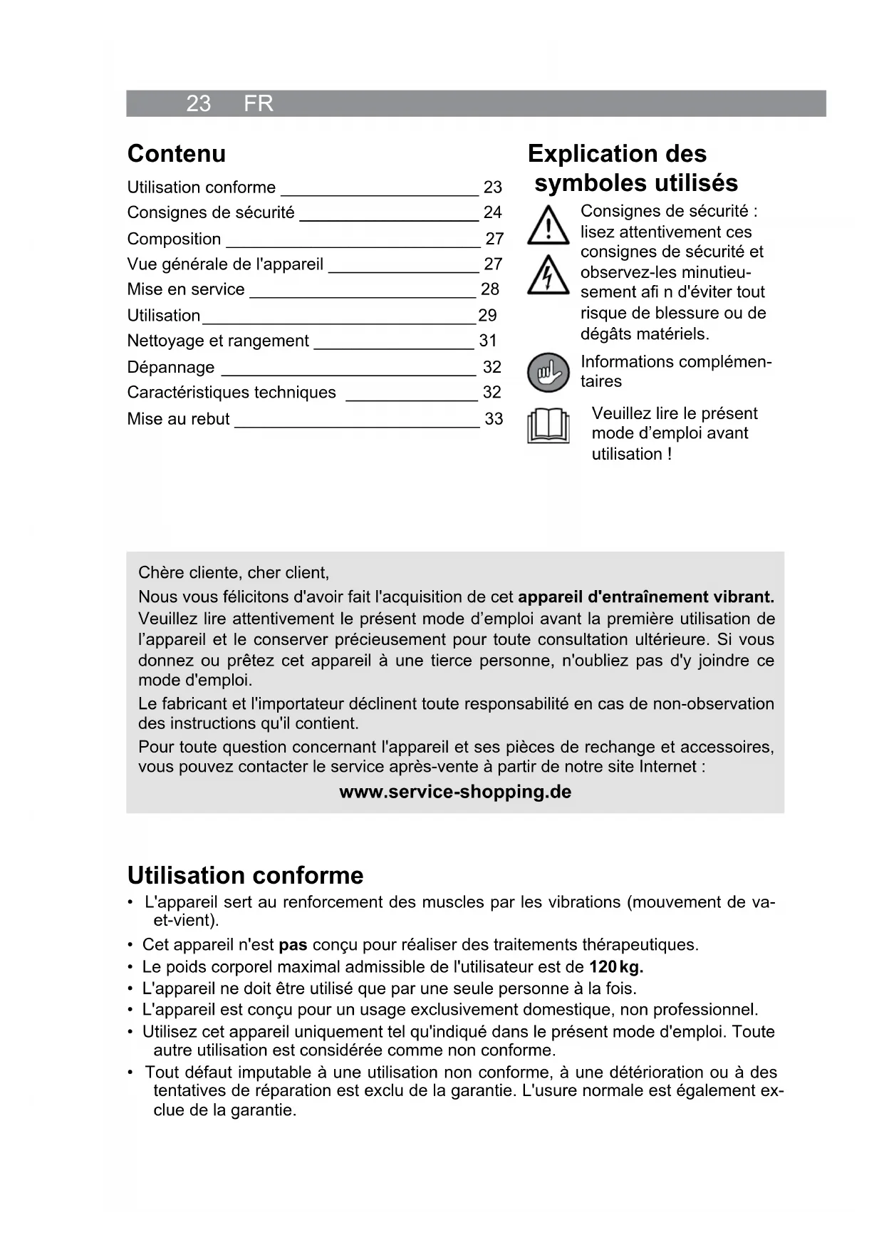 - Tout défaut imputable à une utilisation non conforme, à une détérioration ou à des tentatives de réparation est exclu de la garantie. L'usure normale est également ex- clue de la garantie. Explication des symboles utilisés Consignes de sécurité : lisez attentivement ces consignes de sécurité et observez-les minutieu- sement afi n d'éviter tout risque de blessure ou de dégâts matériels. Informations complémen- taires Veuillez lire le présent mode d’emploi avant utilisation ! Chère cliente, cher client, Nous vous félicitons d'avoir fait l'acquisition de cet appareil d'entraînement vibrant. Veuillez lire attentivement le présent mode d’emploi avant la première utilisation de l’appareil et le conserver précieusement pour toute consultation ultérieure. Si vous donnez ou prêtez cet appareil à une tierce personne, n'oubliez pas d'y joindre ce mode d'emploi. Le fabricant et l'importateur déclinent toute responsabilité en cas de non-observation des instructions qu'il contient. Pour toute question concernant l'appareil et ses pièces de rechange et accessoires, vous pouvez contacter le service après-vente à partir de notre site Internet : www.service-shopping.de Contenu Utilisation conforme _____________________ 23 Consignes de sécurité ___________________ 24 Composition ___________________________ 27 Vue générale de l'appareil ________________ 27 Mise en service ________________________ 28 Utilisation _____________________________ 29 Nettoyage et rangement _________________ 31 Dépannage ___________________________ 32 Caractéristiques techniques ______________ 32 Mise au rebut __________________________ 33FR 24 Consignes de sécurité ■ Cet appareil peut être utilisé par les enfants à partir de 8 ans et plus et les personnes dont les capacités physiques, senso- rielles ou mentales sont amoindries et/ou manquant d’expé- rience et de connaissances lorsqu'elles sont sous surveillance ou qu’elles ont été instruites quant à l'utilisation de l'appareil en toute sécurité et qu'elles comprennent les risques en découlant. ■ Les enfants ne doivent pas jouer avec l'appareil. ■ Le nettoyage et la maintenance de l'utilisateur ne doivent pas être réalisés par des enfants sans surveillance. ■ Tenez l'appareil et son cordon d'alimentation hors de portée des animaux et des enfants de moins de 8 ans. ■ L'appareil doit toujours être débranché du secteur lorsqu'il n'est pas sous surveillance, avant d'être assemblé, démonté ou net- toyé. ■ Lorsque le cordon de raccordement au secteur de cet appa- reil est endommagé, il convient de le remplacer par un cordon spécial disponible auprès du fabricant ou de son service après- vente. ■ Ne procédez à aucune modifi cation sur l'appareil. Si l'appareil est endommagé, c'est au fabricant, au service après-vente ou à toute personne aux qualifi cations similaires (par ex. un atelier spécialisé) qu'il revient de le réparer afi n d'éviter tout danger. Risques de blessure ■ Ne laissez pas les fi lms d'emballage à la portée des enfants ou des animaux. Risque de suffocation ! ■ Afi n que personne ne risque de trébucher, veillez à ce que le cordon d'alimentation branché ne gêne pas le passage. ■ Si vous appartenez à un groupe à risque, du point de vue santé, ou si vous n’avez pas fait de sport pendant une assez longue période ou que vous avez des problèmes d'équilibre, vasculaires ou orthopédiques, consultez votre médecin avant d’utiliser cet appareil. Le cas échéant, adaptez le programme d’entraînement suivant ses conseils. ■ N'utilisez pas l'appareil si vous avez des fractures récentes ou des cicatrices posto- pératoires encore fraîches. ■ N'utilisez pas l'appareil en cas d'infl ammations veineuses, de thrombose, de tumeurs ou autres infl ammations aiguës. Consultez votre médecin pour savoir si une applica- tion est inoffensive pour vous. ■ Les femmes enceintes sont censées ne pas utiliser cet appareil, ou du moins pas sans l'accord préalable de leur médecin.25 FR ■ Commencez par le niveau de vibration le plus bas puis augmentez progressivement l'intensité. Nous attirons expressément l'attention sur le fait qu'une utilisation inadé- quate de l'appareil et une application excessive peuvent nuire à la santé. ■ ATTENTION ! Arrêtez immédiatement l'application en cas de vertige ou si vous vous sentez affaibli. En cas de nausée, de douleurs dans la poitrine ou dans les membres, de palpitations, ou de tout autre symptôme, consultez immédiatement un médecin. ■ Assurez-vous avant chaque mise en service d'avoir assez d'espace libre autour de l'appareil de sorte à ne pas vous cogner aux murs, meubles, etc. durant l'utilisation. ■ L'appareil ne doit être utilisé que par une seule personne à la fois. Risque d'électrocution et risque d'incendie ■ Afi n de prévenir tout risque d'électrocution, ne mettez pas l'appareil, le cordon du secteur et la télécommande à proximité de l'eau ou d'autres liquides. Ne touchez jamais à ces parties avec les mains mouillées ou humides. Si l'appareil tombe dans l'eau, coupez immédiatement l'alimentation électrique. N'essayez pas d'extraire l'ap- pareil de l'eau lorsqu'il est raccordé au secteur ! ■ Utilisez et entreposez l'appareil uniquement dans des pièces fermées. Ne l'utilisez pas en plein air ni dans des locaux à taux d'humidité élevé ou encore sur des sur- faces chaudes. ■ N'utilisez pas l'appareil en présence de gaz facilement infl ammables dans l'atmos- phère. N'utilisez pas l'appareil à proximité d'une source de gaz. ■ Placez l'appareil exclusivement sur une surface sèche, plane et solide. Si vous uti- lisez l'appareil sur un tapis, assurez-vous que les orifi ces d'aération en dessous de l'appareil restent dégagés. ■ Veillez à ce que le cordon ne soit ni pincé, ni coincé, ni posé sur des bords saillants et qu'il n'entre pas en contact avec des surfaces chaud
