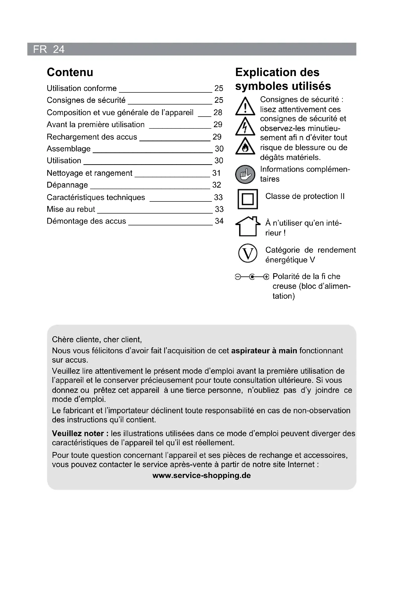 Chère cliente, cher client, Nous vous félicitons d’avoir fait l’acquisition de cet aspirateur à main fonctionnant sur accus. Veuillez lire attentivement le présent mode d’emploi avant la première utilisation de l’appareil et le conserver précieusement pour toute consultation ultérieure. Si vous donnez ou prêtez cet appareil à une tierce personne, n’oubliez pas d’y joindre ce mode d’emploi. Le fabricant et l’importateur déclinent toute responsabilité en cas de non-observation des instructions qu’il contient. Veuillez noter : les illustrations utilisées dans ce mode d’emploi peuvent diverger des caractéristiques de l’appareil tel qu’il est réellement. Pour toute question concernant l’appareil et ses pièces de rechange et accessoires, vous pouvez contacter le service après-vente à partir de notre site Internet : www.service-shopping.de25 FR Utilisation conforme