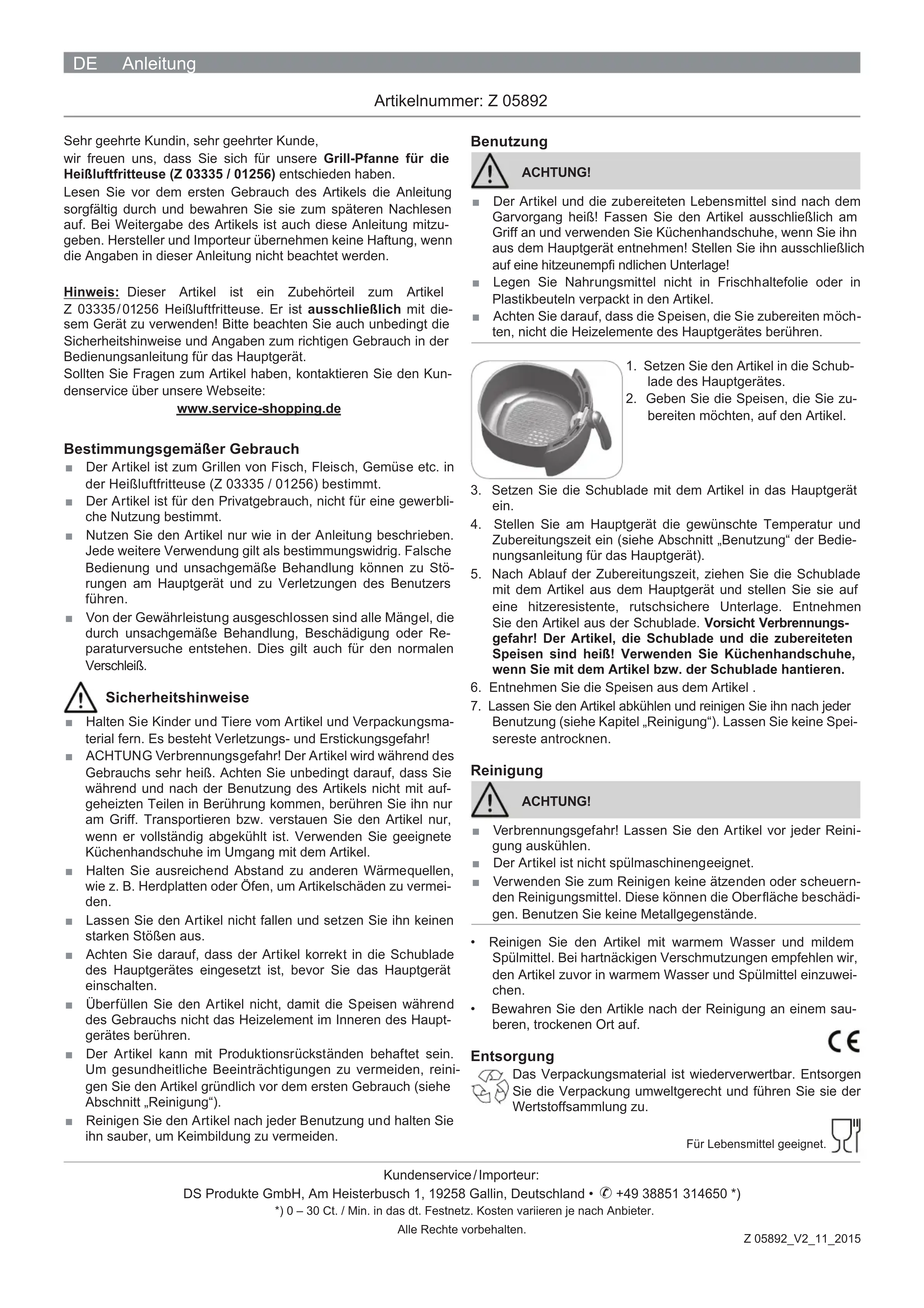 - After cleaning, store the product in a dry, clean place. Disposal The packaging material is recyclable. Dispose of the pack- aging in an environmentally-friendly manner and make it available to the collection service for recyclable materials. Z 05892_V2_11_2015Suitable for use with food. Product number: Z 05892FR Mode d’emploi Service après-vente/importateur : DS Produkte GmbH, Am Heisterbusch 1, D-19258 Gallin, Allemagne • ✆ +49 38851 314650 *) *) Prix d’un appel vers le réseau fi xe allemand. Coût variable selon le prestataire. Tous droits réservés. Chère cliente, cher client, nous nous réjouissons que vous ayez décidé d’acheter notre poêle à griller pour la friteuse à air chaud (Z 03335 / 01256). Avant d’utiliser pour la première fois l’article, veuillez lire attenti- vement ce mode d’emploi et le conserver précieusement pour le consulter ultérieurement. Si vous cédez l’article à un tiers, veuillez également lui remettre ce mode d’emploi. Le fabricant et l’impor- tateur déclinent toute responsabilité si les indications de ce mode d’emploi ne sont pas respectées. Remarque : Cet article est un accessoire de l’article Z 03335 / 01256 friteuse à air chaud. Il s’utilise exclusivement avec cet appareil ! Veuillez impérativement tenir compte des consignes de sécurité et des indications sur le bon usage du mode d’emploi de l’appareil principal. Si vous avez des questions sur l’article, veuillez vous adresser au service après-vente sur notre site Internet : www.service-shopping.de Utilisation adéquate