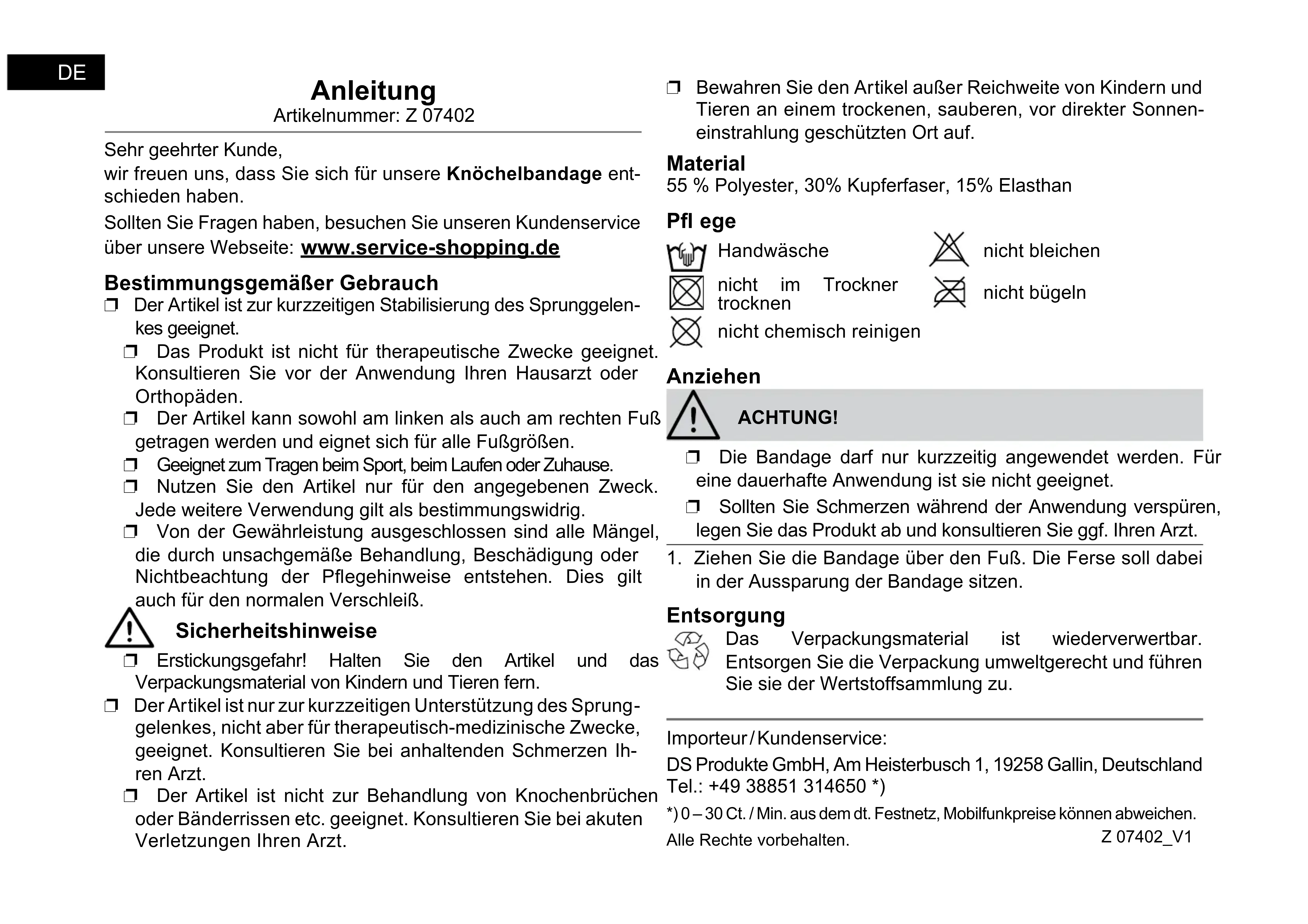 the recess of the bandage. Disposal The packaging material is recyclable. Dispose of the packaging in an environmentally-friendly manner and make it available to the collection service for recyclable materials. Importer/customer service: DS Produkte GmbH, Am Heisterbusch 1, 19258 Gallin, Germany Tel.: +49 38851 314650 *) *) Calls subject to a charge. All rights reserved. Z 07402_V1 GBNotice Numéro de référence : Z 07402 Cher client, Nous nous réjouissons que vous ayez décidé d'acheter notre bandage de cheville. Si vous aviez des questions, veuillez aller sur le site Internet de notre service après-vente : www.service-shopping.de Utilisation adéquate ❐ L'article sert à la stabilisation des articulations de la cheville à court terme. ❐ Le produit n’est pas adapté à des fi ns thérapeutiques. Consultez votre médecin ou un orthopédiste avant de vous servir de la ceinture. ❐ L'article peut être utilisé aussi bien pour le pied gauche que pour le pied droit et convient à toutes les tailles de pied. ❐ Il peut être porté au sport, pendant la marche ou à la maison. ❐ Utilisez l'article uniquement dans le but indiqué. Toute autre utilisation est considérée comme contraire aux dispositions. ❐ Sont exclus de la garantie tous les défauts causés par une manipulation non appropriée, par un dommage ou un non-respect des consignes d'entretien. Ceci est aussi valable pour l’usure normale. Consignes de sécurité ❐ Risque d'asphyxie ! Gardez l'article et le matériel d'emballage éloignés des enfants et des animaux. ❐ L'article est uniquement destiné à soulager la cheville à court terme et n'a aucune fonction thérapie-médicale. En cas de douleurs persistantes, veuillez consulter votre médecin. ❐ L'article n'est pas destiné à traiter les chevilles cassées ou les déchirures de ligaments etc. En cas de blessures graves, veuillez consulter votre médecin. ❐ Rangez l'article hors de portée des enfants et des animaux dans un endroit sec, propre et protégé contre les rayons di- rects du soleil. Matières 55 % polyester, 30 % fi bre de cuivre, 15% élasthanne Entretien lavable à la main nettoyage chimique interdit ne pas blanchir ne pas sécher dans un séchoir ne pas repasser Passer l'article ATTENTION ! ❐ La bandage doit être utilisée sur de brefs intervalles de temps uniquement. Elle n’est pas appropriée à un port permanent. ❐ Si vous ressentez des douleurs lors du port, enlevez immédiatement la ceinture et consultez votre médecin si nécessaire.