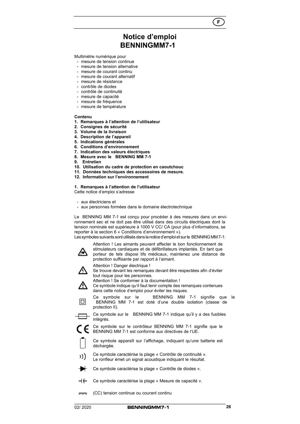 Cette notice d’emploi s’adresse - aux électriciens et - aux personnes formées dans le domaine électrotechnique Le BENNING MM 7-1 est conçu pour procéder à des mesures dans un envi- ronnement sec et ne doit pas être utilisé dans des circuits électriques dont la tension nominale est supérieure à 1000 V CC/ CA (pour plus d’informations, se reporter à la section 6 « Conditions d’environnement »). Les symboles suivants sont utilisés dans la notice d’emploi et sur le BENNING MM 7-1: Attention ! Les aimants peuvent affecter le bon fonctionnement de stimulateurs cardiaques et de défibrillateurs implantés. En tant que porteur de tels disposi tifs médicaux, maintenez une distance de protection suffisante par rapport à l‘aimant.