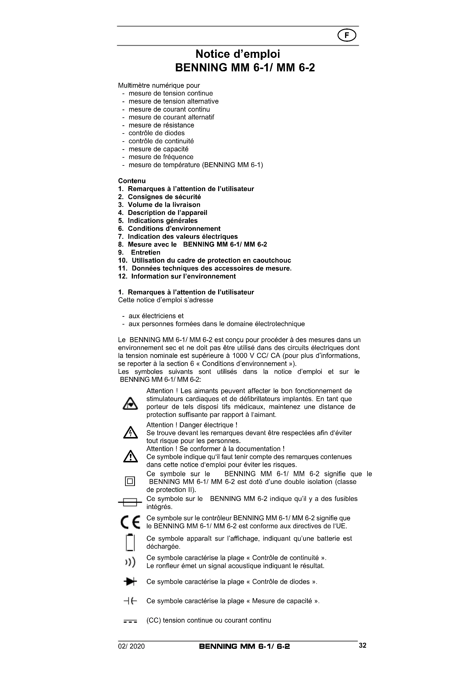 Dans certaines conditions, la sécurité de manipulation du BENNING MM 6-1/ MM 6-2 n’est plus donnée ; par exemple, en cas :02/ 2020