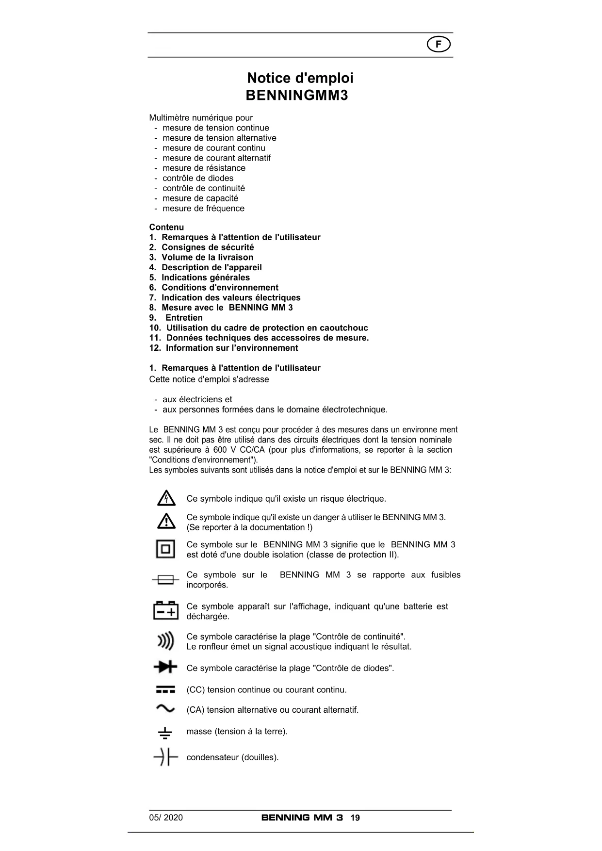Notice d'emploi BENNING MM 3 Multimètre numérique pour - mesure de tension continue - mesure de tension alternative - mesure de courant continu - mesure de courant alternatif - mesure de résistance - contrôle de diodes - contrôle de continuité - mesure de capacité - mesure de fréquence Contenu