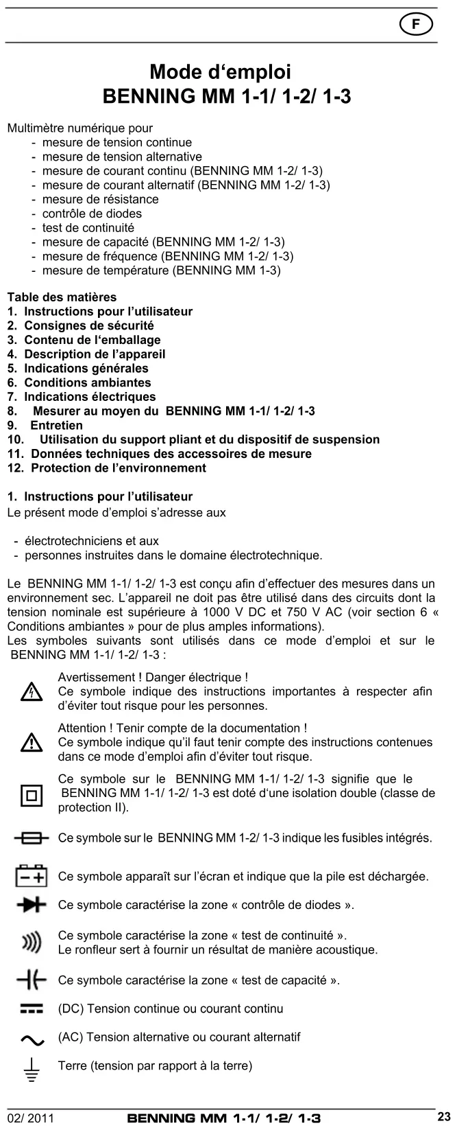 Mode d‘emploi BENNING MM 1‑1/ 1‑2/ 1‑3 Multimètre numérique pour - mesure de tension continue - mesure de tension alternative - mesure de courant continu (BENNING MM 1-2/ 1-3) - mesure de courant alternatif (BENNING MM 1-2/ 1-3) - mesure de résistance - contrôle de diodes - test de continuité - mesure de capacité (BENNING MM 1-2/ 1-3) - mesure de fréquence (BENNING MM 1-2/ 1-3) - mesure de température (BENNING MM 1-3) Table des matières