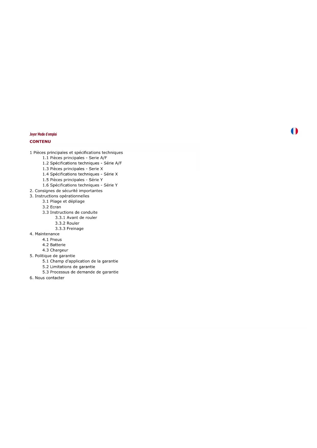 - Cette garantie limite couvre tout défaut de matériel ou de fabrication relatif aux équipements Joyor neufs accompagnés de la présente garantie limitée pour une période de 24 mois à la suite du premier achat, au détail des pièces non électriques et de la trottinette, et pendant une période de 6 mois pour le batterie, dans des conditions normales d'installation, d'utilisation, d'entretien et de maintenance. Seuls les consommateurs qui achètent cet appareil auprès d'un détaillant ou d'un revendeur agréé Joyor peuvent obtenir une couverture en vertu de la présente garantie limitée.
