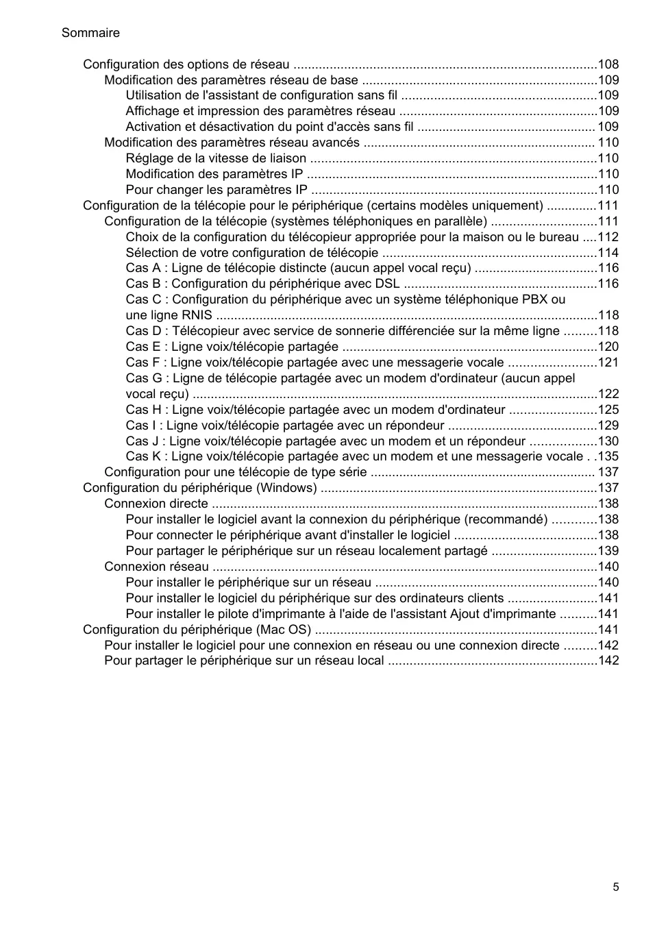 Tâches paramètres 26 Taille dépannage de la copie 186 numérisations, dépannage 192 télécopie caractéristiques techniques 234 envoi 74 mode de réponse 86 rapports 91 réimpression 80 sauvegarde télécopies reçues 79 Télécopie Bis/Pause, bouton 18 bloquer des numéros 16 configuration 111 configuration avec ligne distincte (systèmes téléphoniques en parallèle) 116 configuration avec ligne téléphonique partagée (systèmes téléphoniques en parallèle) 120 configuration avec sonnerie différenciée (systèmes téléphoniques en parallèle) 118 dépannage 193 dépannage du répondeur DSL, configuration (systèmes téléphoniques en parallèle) 116 échec du test 193 effacer le journal 81 en-tête 85 envoi, dépannage 200, 203 Internet 89 journal, impression 92 ligne RNIS, configuration (systèmes téléphoniques en parallèle) 118 messagerie vocale, configuration (systèmes téléphoniques en parallèle) 121 mode de correction d'erreur 87 modem, partagé avec (systèmes téléphoniques en parallèle) 122 modem et ligne vocale, partagé avec (systèmes téléphoniques en parallèle) 125 numérisation 17 numérotation supervisée 76, 77 options de rappel 88 paramètres, modifier 85 pause 28 rapports d'erreur 92 rapports de confirmation 91 réception 78 réception, dépannage 200, 204 réception en mode manuel 78 réponse automatique 17, saisie de texte et de symboles 28 sonnerie distincte, modification du type 87 sonneries avant réponse 86 suppression de la mémoire 81 système PBX, configuration (systèmes téléphoniques en parallèle) 118 systèmes téléphoniques en parallèle 111 transfert 81 type de numérotation, sélection 88 types de configuration 112 vitesse 89 Télécopie de diffusion envoi 77 Télécopie en mode manuel réception 78 Télécopie manuelle envoi 75, 76 Télécopier, boutons couleur 17 noir 17 Télécopies reçues blocage de numéros 82 Télécopieur blocage de numéros 82 Index cordon téléphonique trop court 207 entrées de numérotation rapide, configuration 45 entrées de numérotation rapide de dossier réseau 47 envoi, dépannage 206 groupes de numérotation rapide, configurer 46 modem et messagerie vocale, partagé avec (systèmes téléphoniques en parallèle) 135 modem et répondeur, partagé avec (systèmes téléphoniques en parallèle) 130 répondeur, configuration (systèmes téléphoniques en parallèle) 129 répondeur et modem, partagé avec (systèmes téléphoniques en parallèle) 130 test d'état de la ligne, échec 199 test de connexion du cordon téléphonique, échec 195 test de la configuration 90 test de prise téléphonique murale, échec 195 test de tonalité, échec 198 test de type de cordon téléphonique du télécopieur, échec 196 Téléphone, télécopie à partir d'un réception 78 Téléphone, télécopie à partir de envoi 75 réception 78 Test d'état de la ligne, télécopieur 199 Test de prise téléphonique murale, télécopieur 195 Test de tonalité, échec 198 Test du port correct, télécopieur 195 Tests, télécopie échec 193 Tests, télécopieur configuration 90 connexion au port, échec échec du test de type de cordon téléphonique du télécopieur 196 état de la ligne de télécopie 199 matériel, échec 194 prise téléphonique murale tonalité, échec 198 Têtes d'impression alignement 162 commande en ligne 221 dépannage 176 emplacement 14 entretien 160 état 96, 106, 161 état, vérification 161 garantie 226 nettoyage 163 nettoyer les contacts manuellement 163 prise en charge 231 références 222 remplacement 166 retrait 227 Texte dépannage 178, 181, 183 illisible sur les copies, dépannage 187 impossible à modifier après numérisation, dépannage 189 impression irrégulière sur les copies 187 manquant, dépannage 189 mauvaise impression sur les copies 187 numérisations illisibles 192 saisie à partir du panneau de commande 28 Texte couleur, et OCR 60 Traînée d'encre, dépannage Transfert de télécopies 81 Transparents 34 TWAIN impossible d'activer la source TWAIN 190 numérisation à partir de 59 Type de numérotation, sélection 88 Type de sonnerie de réponse modifier 87 systèmes téléphoniques en parallèle 118