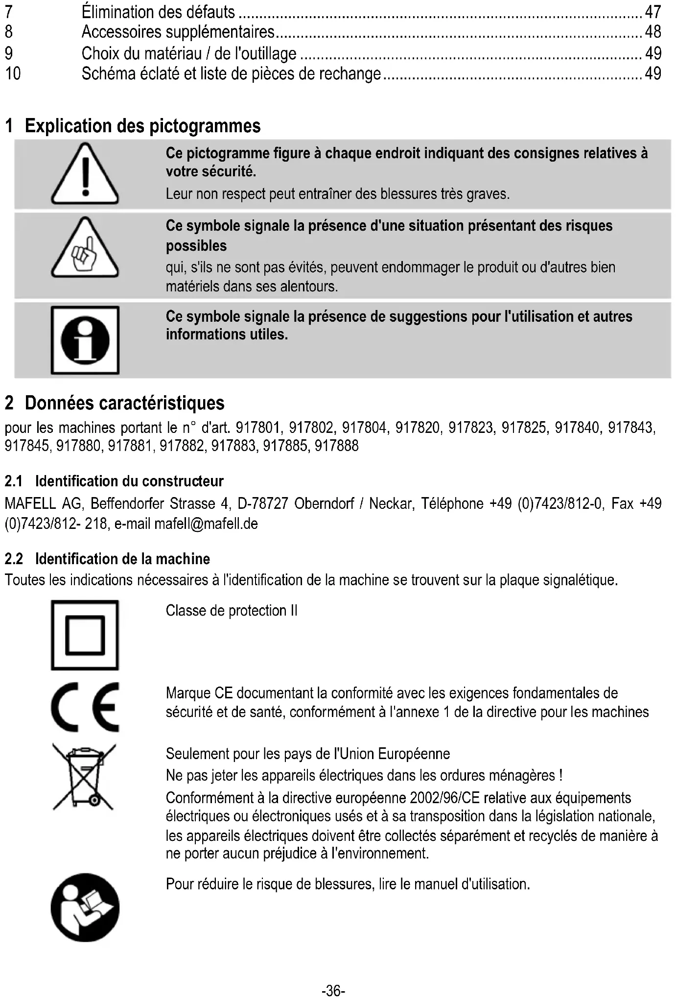 Ce symbole signale la présence de suggestions pour l'utilisation et autres informations utiles. 2 Données caractéristiques pour les machines portant le n° d'art. 917801, 917802, 917804, 917820, 917823, 917825, 917840, 917843, 917845, 917880, 917881, 917882, 917883, 917885, 917888