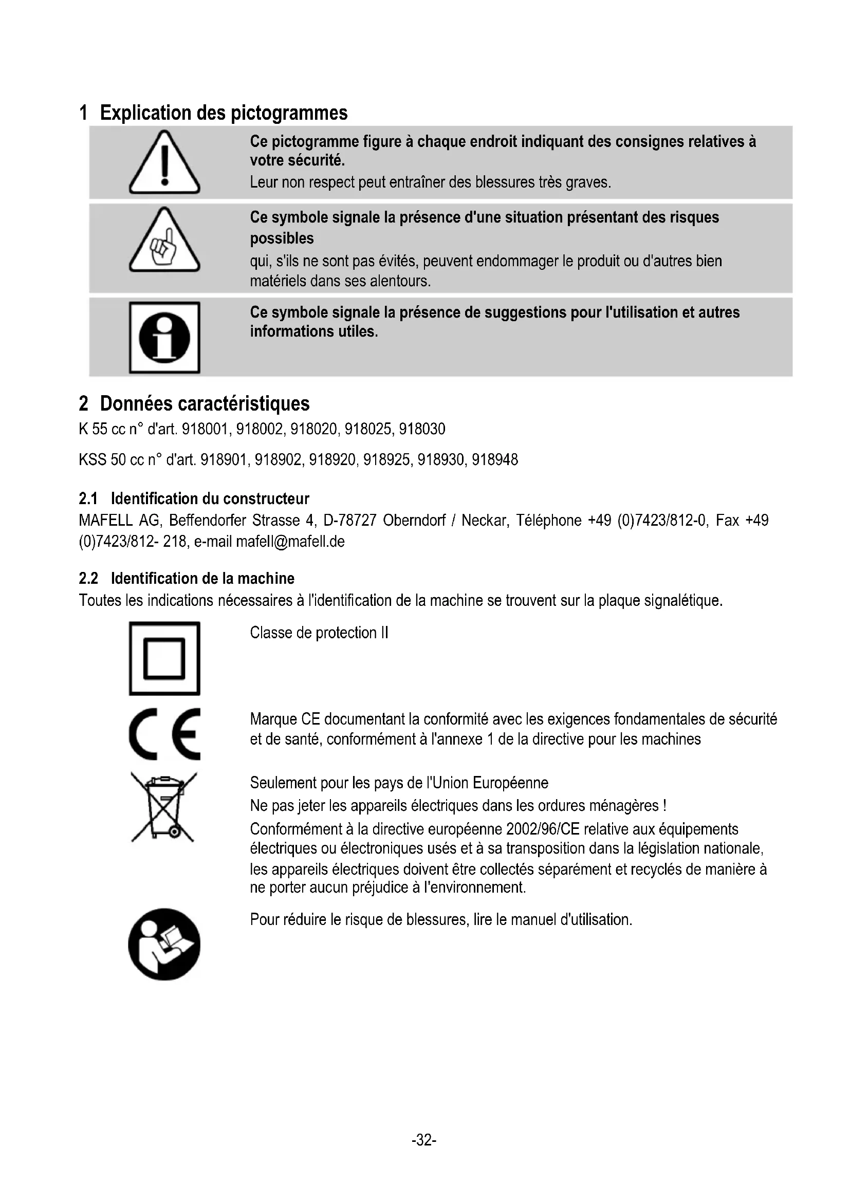 Ce symbole signale la présence de suggestions pour l'utilisation et autres informations utiles. 2 Données caractéristiques K 55 cc n° d'art. 918001, 918002, 918020, 918025, 918030 KSS 50 cc n° d'art. 918901, 918902, 918920, 918925, 918930, 918948