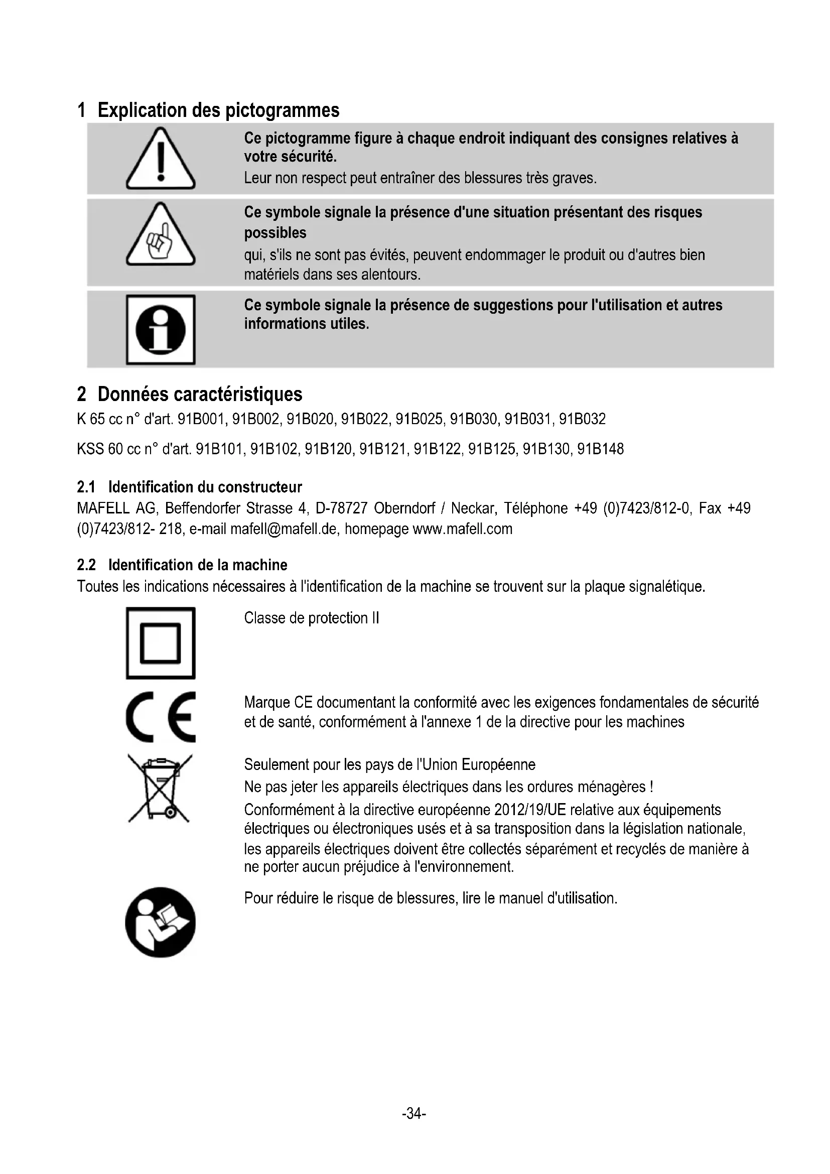 Ce symbole signale la présence de suggestions pour l'utilisation et autres informations utiles. 2 Données caractéristiques K 65 cc n° d'art. 91B001, 91B002, 91B020, 91B022, 91B025, 91B030, 91B031, 91B032 KSS 60 cc n° d'art. 91B101, 91B102, 91B120, 91B121, 91B122, 91B125, 91B130, 91B148