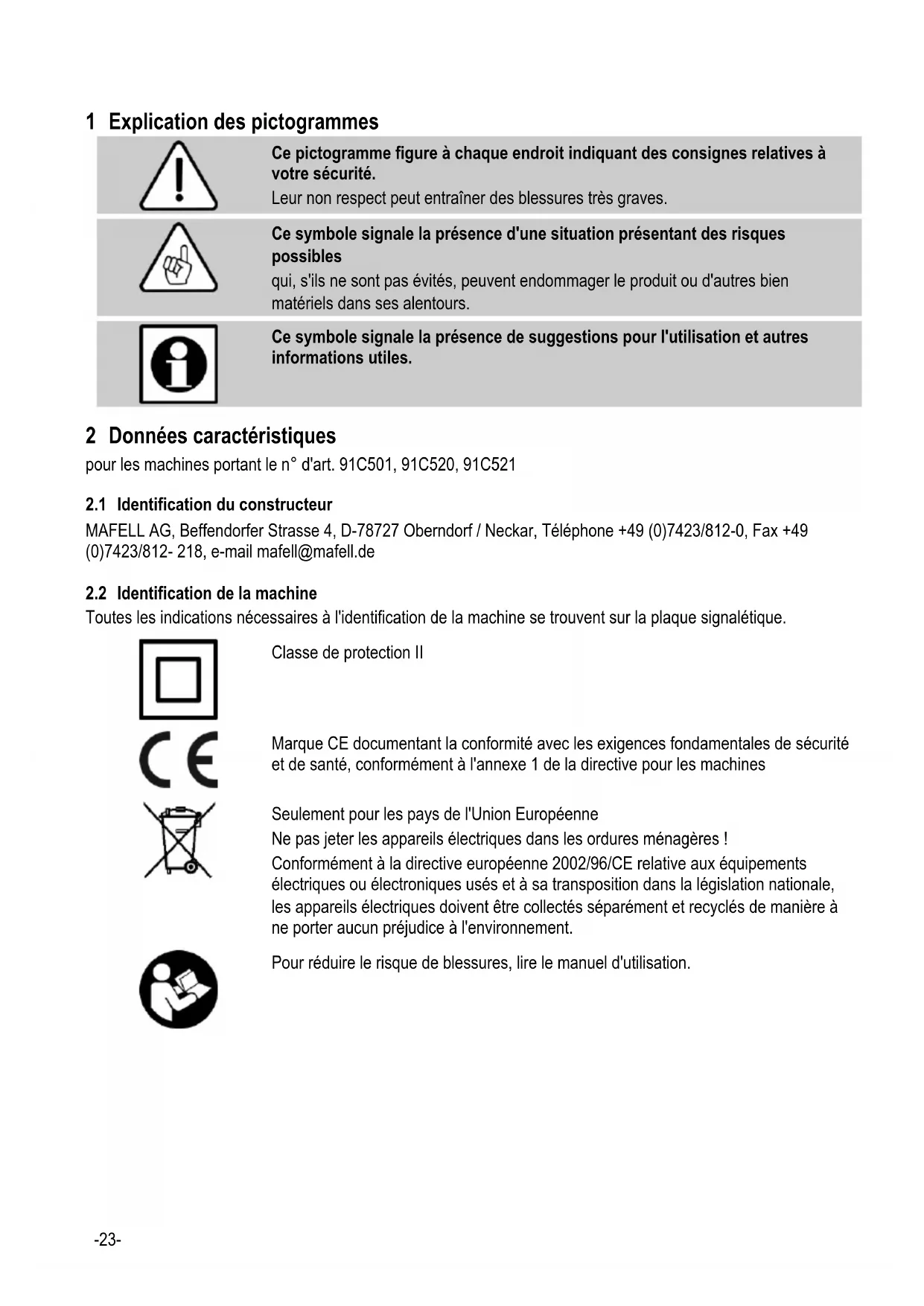 Instructions générales : - Il est interdit à des enfants ou à des adolescents de se servir de la machine. Exception faite des adolescents en cours de formation et sous la surveillance d'un spécialiste compétent. - Ne jamais travailler sans les dispositifs de protection consignés pour l'opération correspondante à effectuer et ne rien modifier sur la machine qui risquerait de porter préjudice à la sécurité. - Les câbles ou les fiches détériorés doivent être remplacés sans retard. Afin de ne pas menacer la sécurité, le remplacement ne doit être fait que par MAFELL ou un atelier de service-après vente autorisé par MAFELL. - Éviter de plier le câble. En particulier, ne pas enrouler le câble autour du moteur de fraisage pendant son transport et son stockage.-26- Consignes de sécurité spécifiques à la machine : - Ne tenir l'outil électrique qu'au niveau des poignées isolées, car l'affleureuse risque de toucher son propre câble d'alimentation. Le contact avec un câble sous tension risque de mettre les parties métalliques de l'appareil sous tension et de provoquer une décharge électrique. - N'exploiter la machine avec la table de fraisage et le capot d'aspiration montés en bonne et due forme. - N'utiliser que des fraises homologuées selon EN 847 pour des vitesses d'au moins 25.000 min