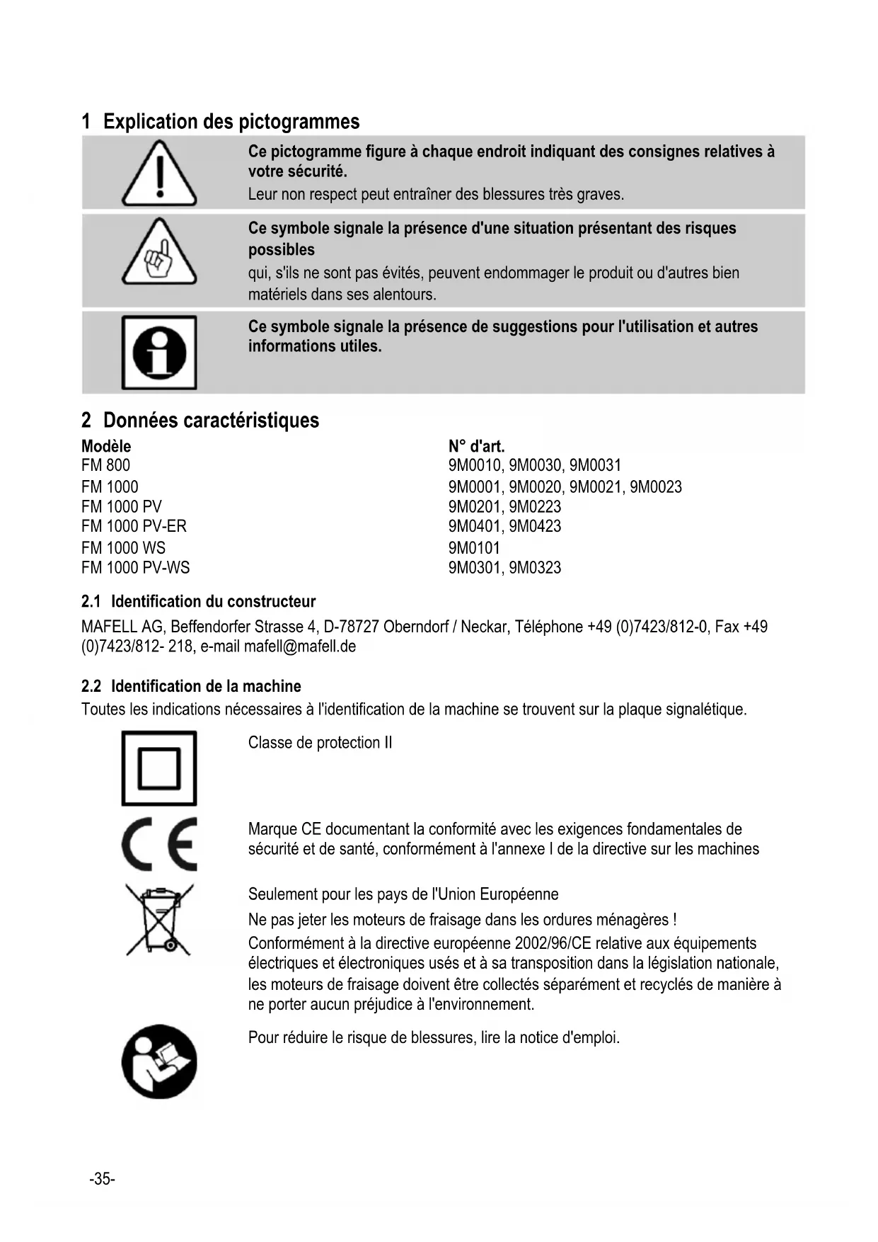 Instructions générales : - Il est interdit à des enfants ou à des adolescents de se servir de la machine. Exception faite des adolescents en cours de formation et sous la surveillance d'un spécialiste compétent. - Ne jamais travailler sans les dispositifs de protection prescrits pour la séquence de travail correspondante du système de portique dans lequel le moteur de fraisage est utilisé. Ne rien modifier sur le système de portique et le moteur de fraisage qui puisse mettre la sécurité en cause. - Les câbles ou les fiches détériorés doivent être remplacés sans retard. Afin de ne pas menacer la sécurité, le remplacement ne doit être fait que par Mafell ou un atelier de service-après vente autorisé par MAFELL. - Éviter de plier le câble. En particulier, ne pas enrouler le câble autour du moteur de fraisage pendant son transport et son stockage. - Il est interdit d'utiliser l'outil en même temps que de l'eau ou des liquides conductibles. - Nous excluons une utilisation en tant que moteur de de fraisage guidé à la main. - Tenir le moteur de fraisage à l’écart de la pluie ou de l’humidité. L’infiltration d’eau dans le moteur de fraisage accroit le risque d’une décharge électrique. Interdiction d'utiliser : - Des outils endommagés et des outils déformés. - Des outils émoussés, car iles sollicitent fortement le moteur. - Des outils non appropriés à la vitesse de rotation du moteur de fraisage en marche à vide. Instructions pour l'utilisation d'équipement de protection personnelle : - Toujours porter un protège-oreilles en travaillant. - Toujours porter un masque de protection contre la poussière en travaillant. - Toujours porter des lunettes de protection pour effectuer tous les travaux. Instructions pour le fonctionnement : - Ne pas mettre les mains dans la zone dangereuse de l'outil. - Vérifier que la pièce à travailler ne contient pas de corps étrangers. - Surveiller la vitesse de rotation. Couper immédiatement l'alimentation en tension en présence d'une augmentation incontrôlé de la vitesse, d'un saut de vitesse-39- Instructions pour entretien et maintenance : - Le nettoyage régulier du moteur de fraisage constitue un facteur de sécurité important. - N'utiliser que des pièces détachées et des accessoires d'origine MAFELL. À défaut de quoi la garantie du constructeur n'est pas assurée et sa responsabilité est dégagée. 4 Équipement / Réglage