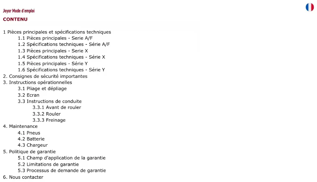 - Cette garantie limitée couvre tout défaut de matériel ou de fabrication relatif aux équipements Joyor neufs accompagnés de la présente garantie limitée pour une période de 24 mois à la suite du premier achat au détail des pièces non électriques et de la trottinette, et pendant une période de 6 mois pour le batterie, dans des conditions normales d'installation, d'utilisation, d'entretien et de maintenance.