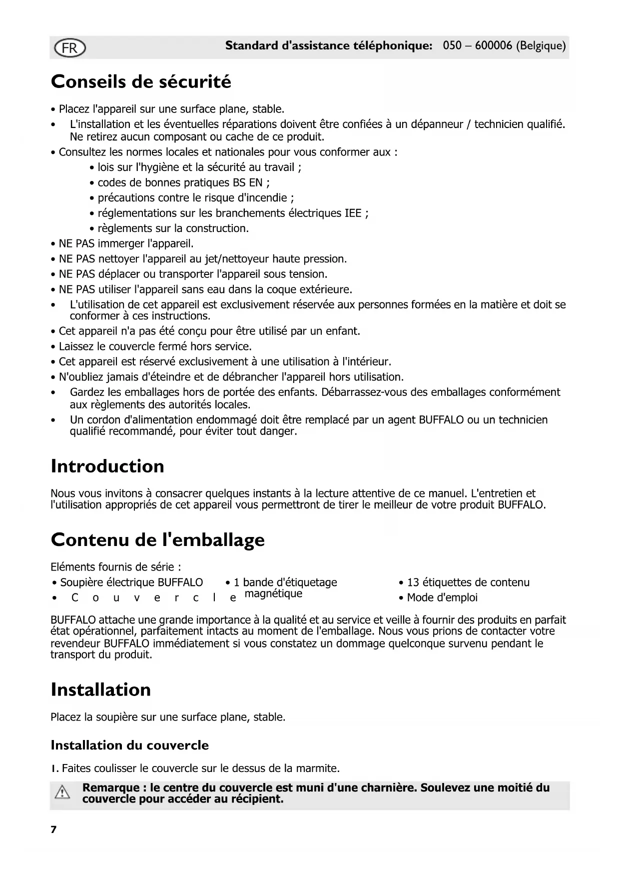 - Un cordon d'alimentation endommagé doit être remplacé par un agent BUFFALO ou un technicien qualifié recommandé, pour éviter tout danger. Introduction Nous vous invitons à consacrer quelques instants à la lecture attentive de ce manuel. L'entretien et l'utilisation appropriés de cet appareil vous permettront de tirer le meilleur de votre produit BUFFALO. Contenu de l'emballage Eléments fournis de série : BUFFALO attache une grande importance à la qualité et au service et veille à fournir des produits en parfait état opérationnel, parfaitement intacts au moment de l'emballage. Nous vous prions de contacter votre revendeur BUFFALO immédiatement si vous constatez un dommage quelconque survenu pendant le transport du produit. Installation Placez la soupière sur une surface plane, stable. Installation du couvercle