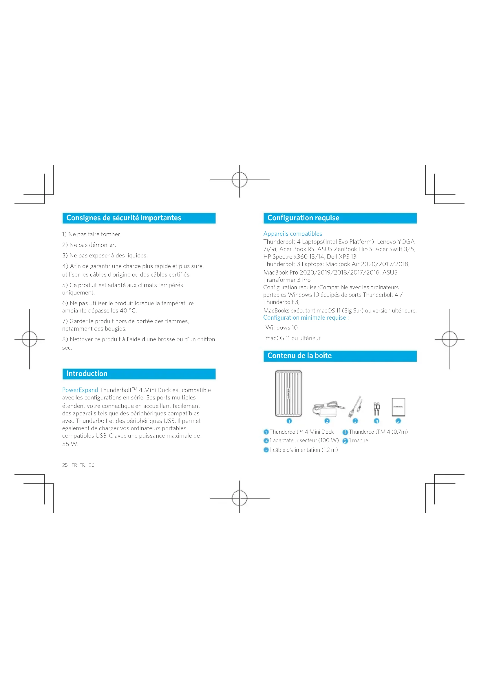 4 Mini Dock est compatible avec les configurations en série. Ses ports multiples étendent votre connectique en accueillant facilement des appareils tels que des périphériques compatibles avec Thunderbolt et des périphériques USB. Il permet également de charger vos ordinateurs portables compatibles USB-C avec une puissance maximale de 85 W. Configuration requise Appareils compatibles Thunderbolt 4 Laptops(Intel Evo Platform): Lenovo YOGA 7i/9i, Acer Book RS, ASUS ZenBook Flip S, Acer Swift 3/5, HP Spectre x360 13/14, Dell XPS 13 Thunderbolt 3 Laptops: MacBook Air 2020/2019/2018, MacBook Pro 2020/2019/2018/2017/2016, ASUS Transformer 3 Pro Configuration requise :Compatible avec les ordinateurs portables Windows 10 équipés de ports Thunderbolt 4